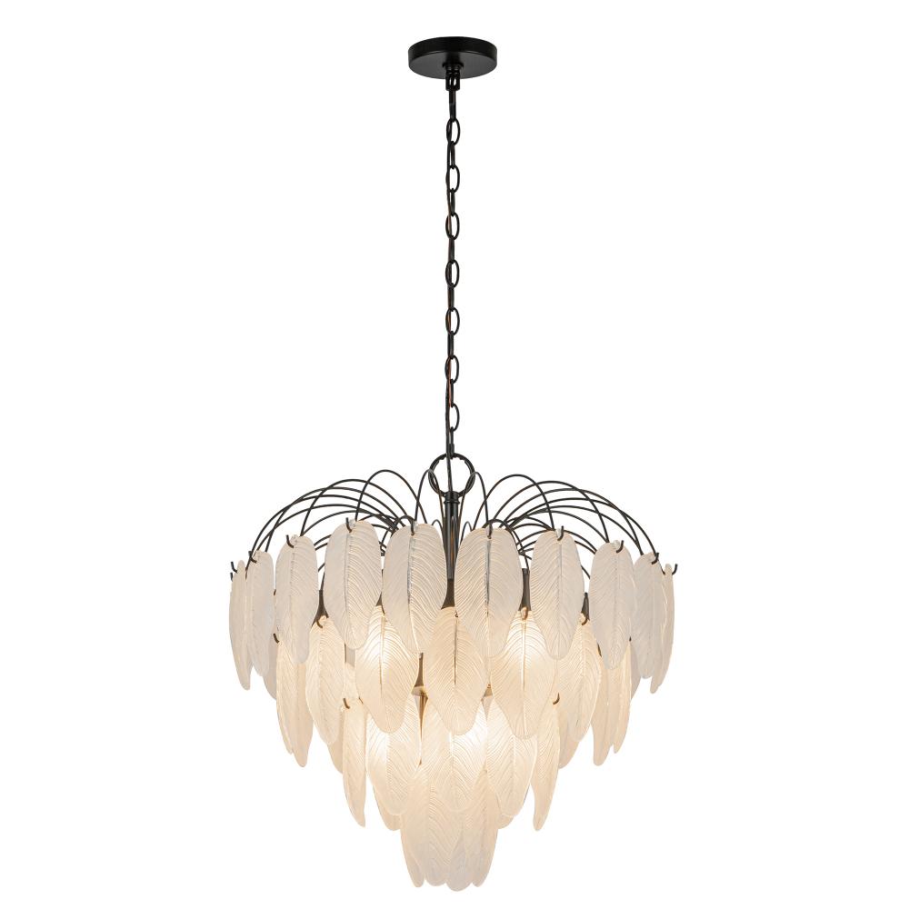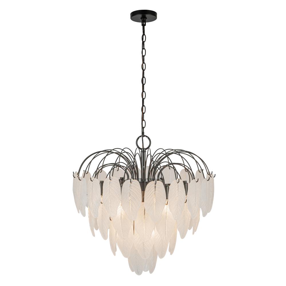 The Alessia Collection chandelier is a captivating blend of modern elegance and nature-inspired artistry. Its bold black frame cradles cascading glass leaves, each etched with organic, lifelike details that evoke a serene forest canopy. With its enchanting glow, this chandelier helps transforms any space. (22.5" inch diameter)