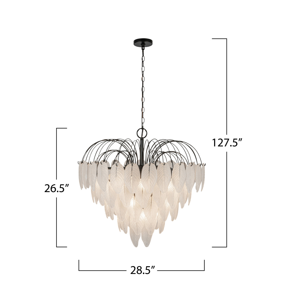 The Alessia Collection chandelier is a captivating blend of modern elegance and nature-inspired artistry. Its bold black frame cradles cascading glass leaves, each etched with organic, lifelike details that evoke a serene forest canopy. With its enchanting glow, this chandelier helps transforms any space. (28.5" inch diameter)