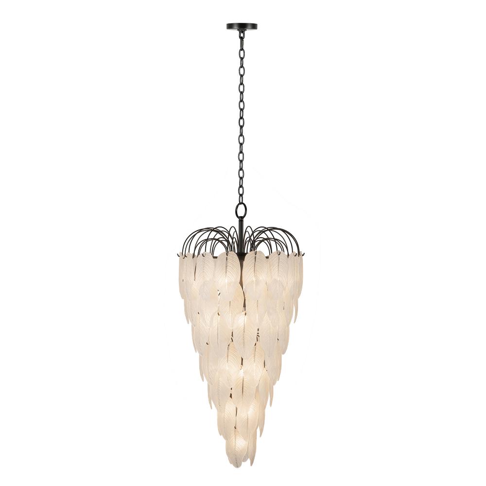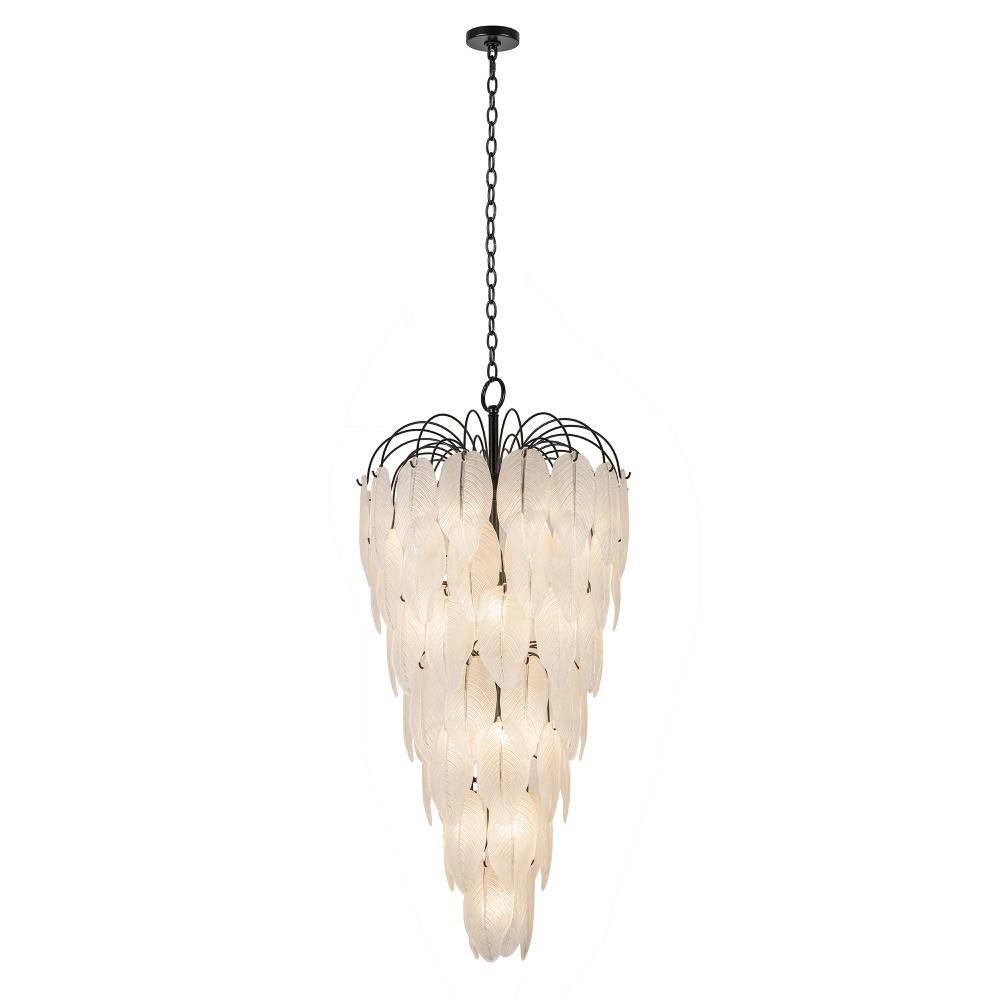 The Alessia Collection foyer chandelier is a captivating blend of modern elegance and nature-inspired artistry. Its bold black frame cradles cascading glass leaves, each etched with organic, lifelike details that evoke a serene forest canopy. With its enchanting glow, this chandelier helps transforms any foyer or staircase area. (57" in length)