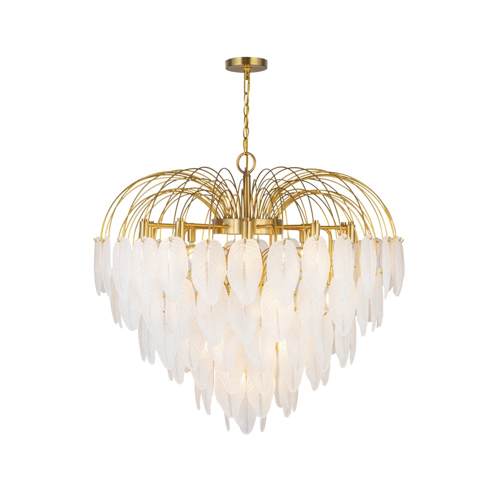 The Alessia collection boasts a captivating design featuring delicate glass leaves suspended from a brilliant airy brass frame. The unique glassware diffuses light casting a mesmerizing and enchanting ambiance in any space. With its harmonious blend of timeless brass elegance and nature-inspired elements, this collection seamlessly combines sophistication and organic beauty, making it a striking centerpiece for any room. The model shown is a 24 light 32" diameter chandelier (Multiple sizes available) (height adjustable via chain)