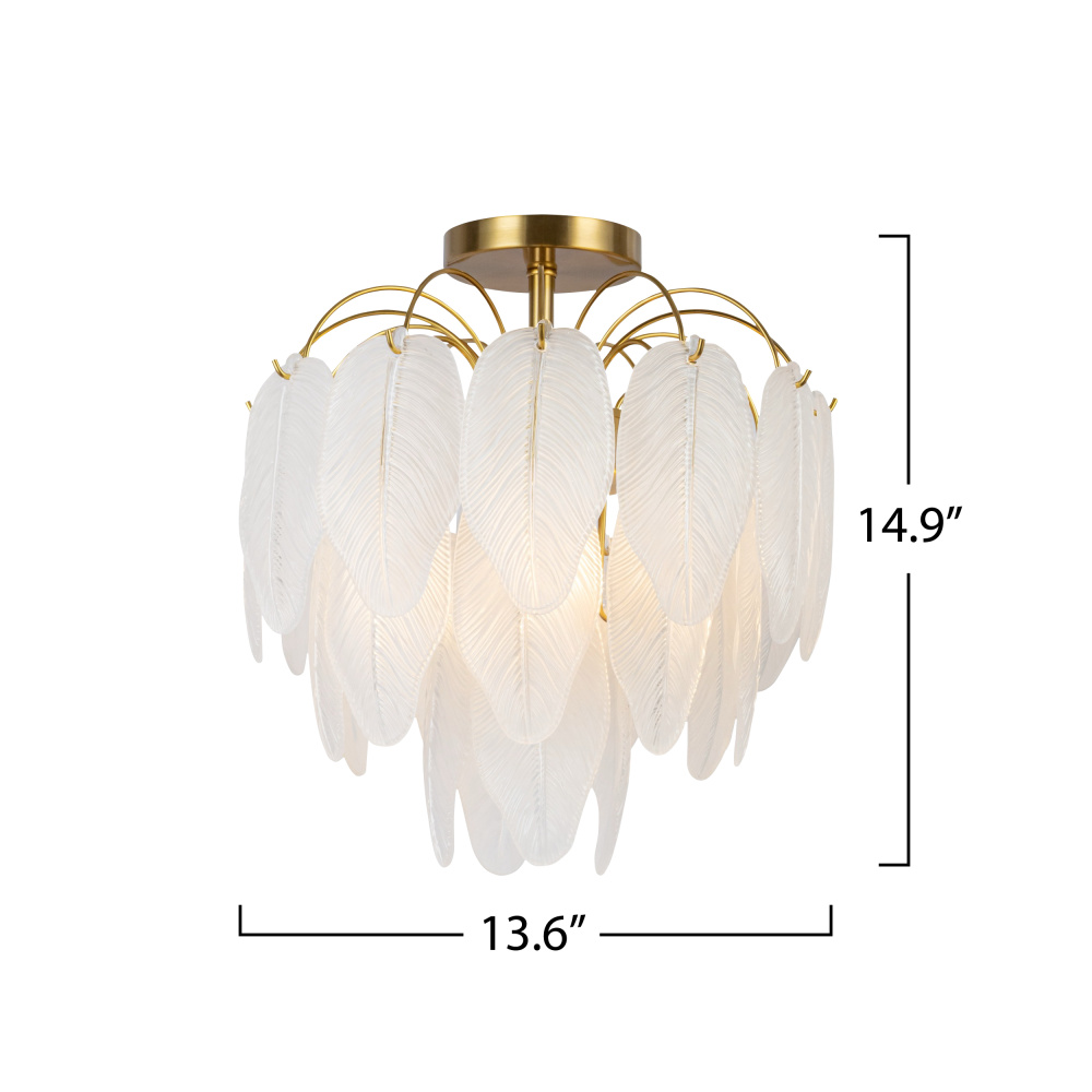 The Alessia collection boasts a captivating design featuring delicate glass leaves suspended from a brilliant airy brass frame. The unique glassware diffuses light casting a mesmerizing and enchanting ambiance in any space. With its harmonious blend of timeless brass elegance and nature-inspired elements, this collection seamlessly combines sophistication and organic beauty, making it a striking centerpiece for any room. The model shown is a 4 light semi flushmount (matching chandelier available)