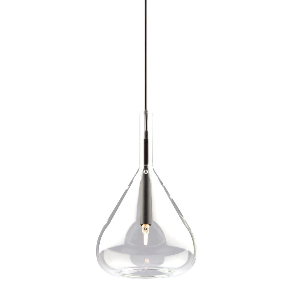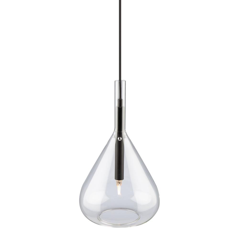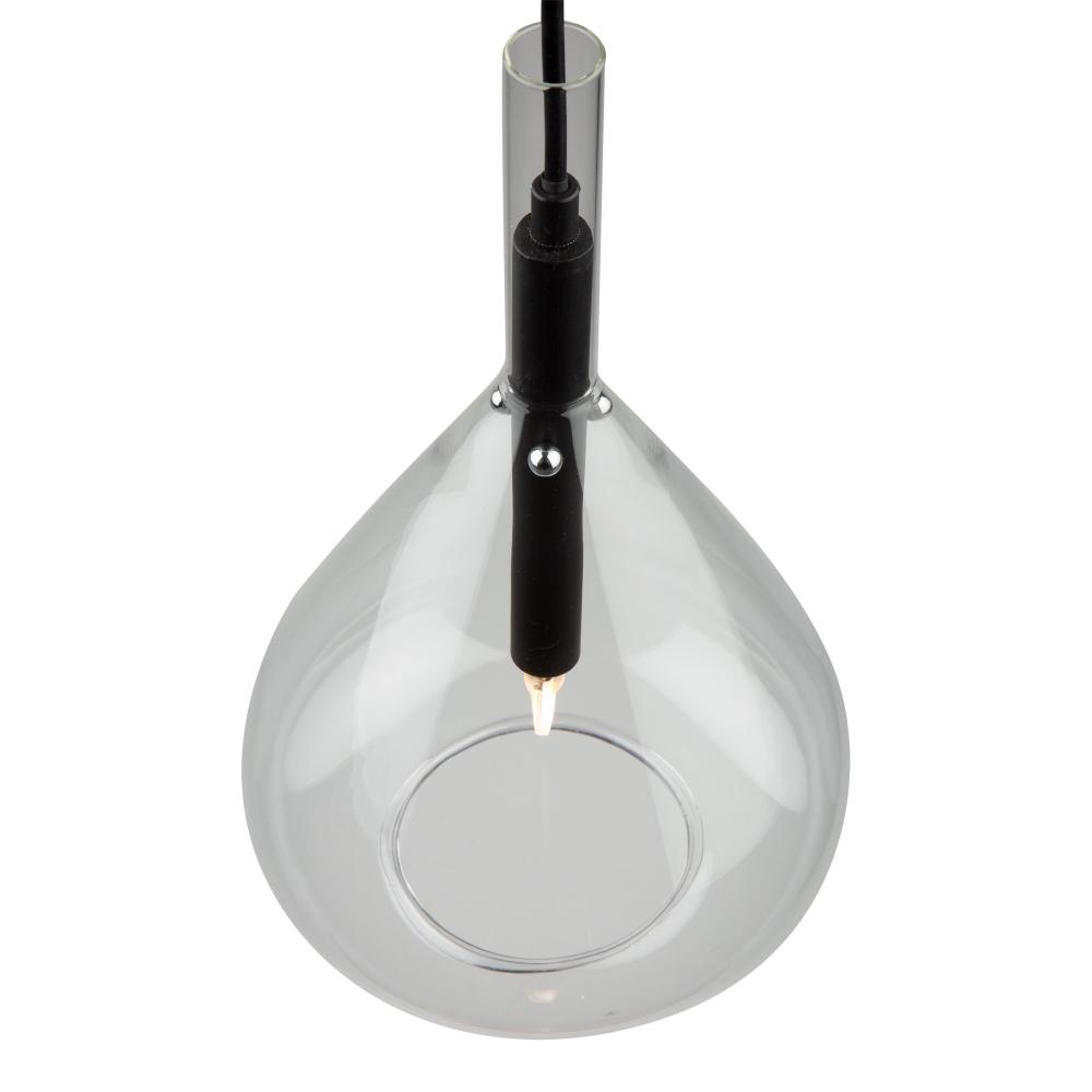 The Conic collection features a uniquely shaped glass design suspended on black frames. The glass is suspended by 3 nickel bullets to give it a floating effect. The bottom of the glass is open for each access to the bulbs. To finish off the design, the wiring has black textile covering.