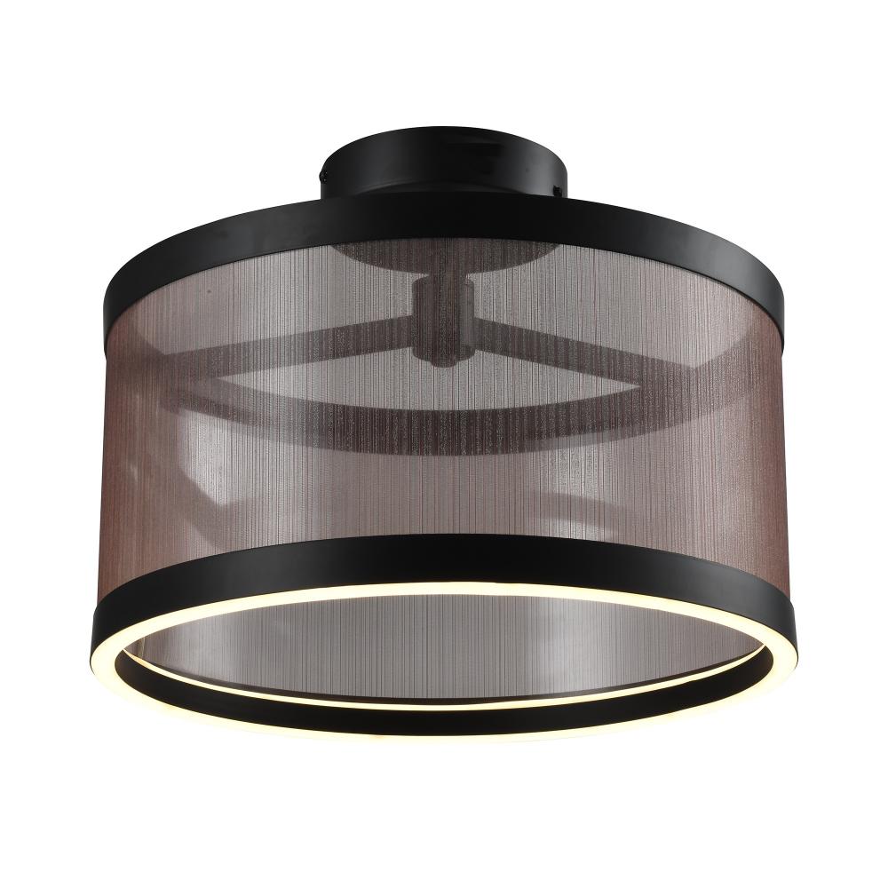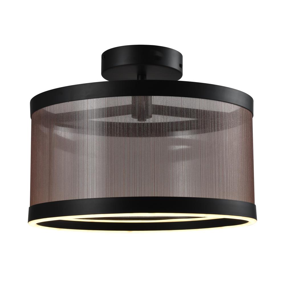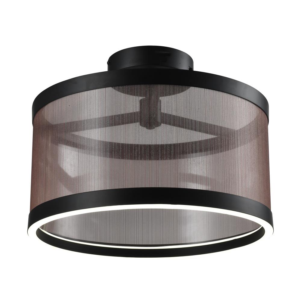 The Cora Collection semi flushmount enchants with its modern elegance, showcasing a sleek black metal frame paired with a bronze organza hardback shade. This LED chandelier exudes a soft yet striking glow, illuminating through its bottom ring to create a warm ambiance. Equipped with a versatile 5CCT switch, it offers customizable lighting to suit any mood or setting. This design seamlessly blends functionality and style, making it a refined statement piece for any interior.