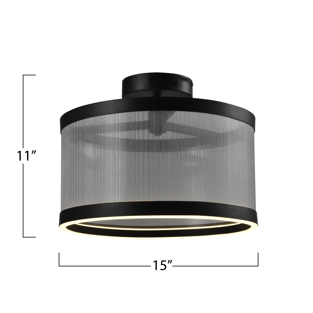 The Cora Collection semi flushmount enchants with its modern elegance, showcasing a sleek black metal frame paired with a silver organza hardback shade. This LED chandelier exudes a soft yet striking glow, illuminating through its bottom ring to create a warm ambiance. Equipped with a versatile 5CCT switch, it offers customizable lighting to suit any mood or setting. This design seamlessly blends functionality and style, making it a refined statement piece for any interior.