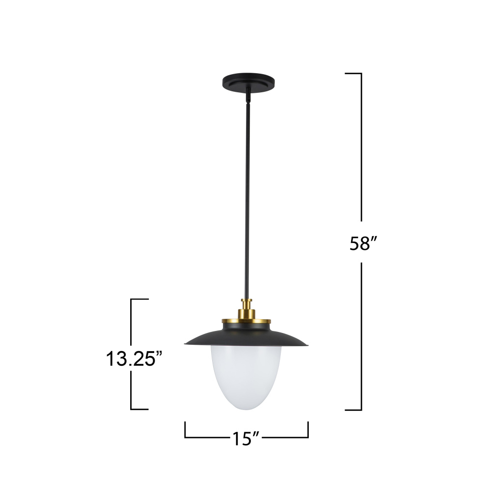 The Dahlia collection pendant designed by the Lighting Pulse, radiates understated charm with its striking black frame and refined brass accents, making it a centerpiece of modern sophistication. Its opulent white glass diffuses a soft, inviting glow, creating a serene ambiance in any space. Thoughtfully crafted with a built-in hang-straight feature, it ensures compatibility with sloped ceilings, effortlessly blending form and function. This model can be mounted as a rod pendant, or as a semi-flushmount light. (Rods are included, allowing you to hang this fixture at your desired height)