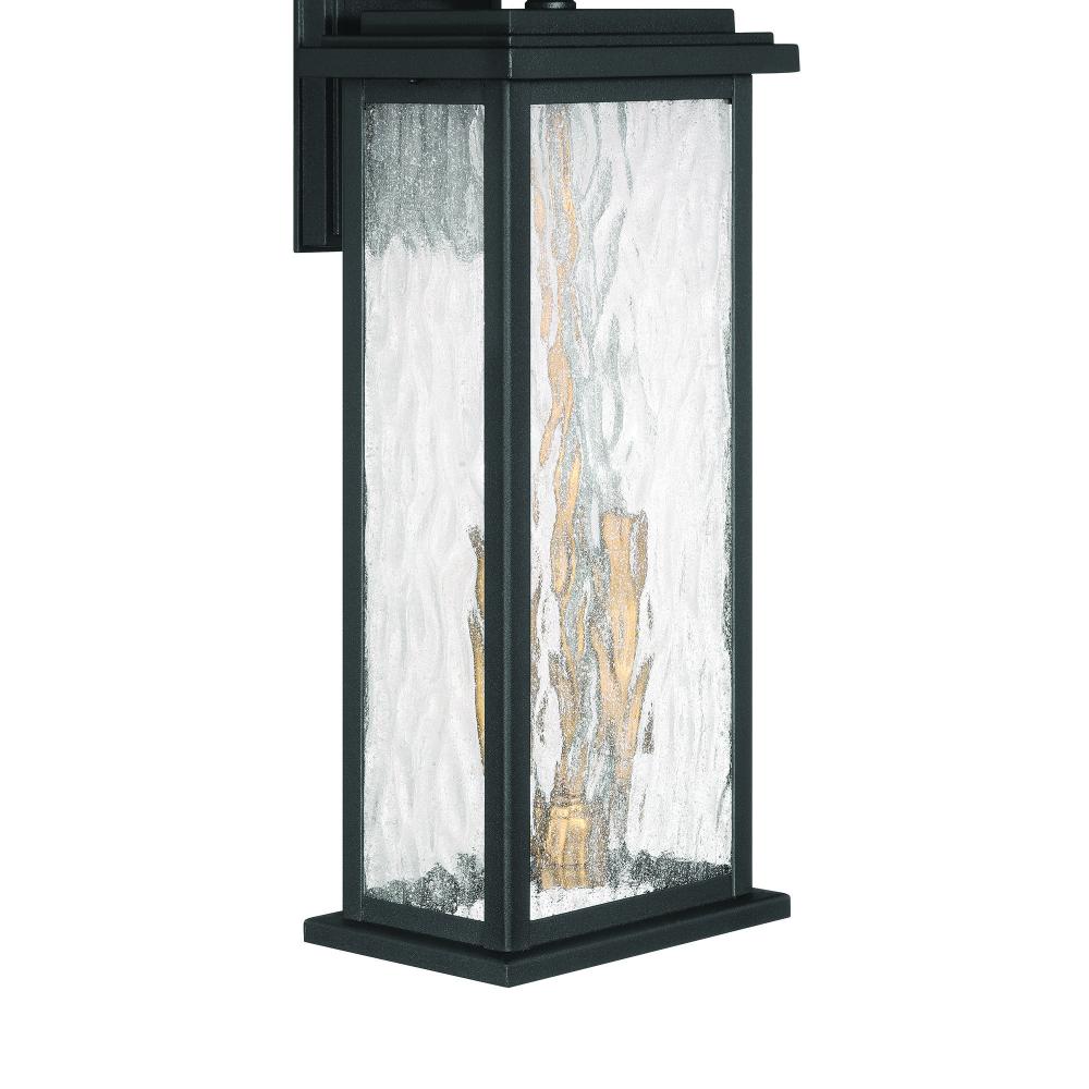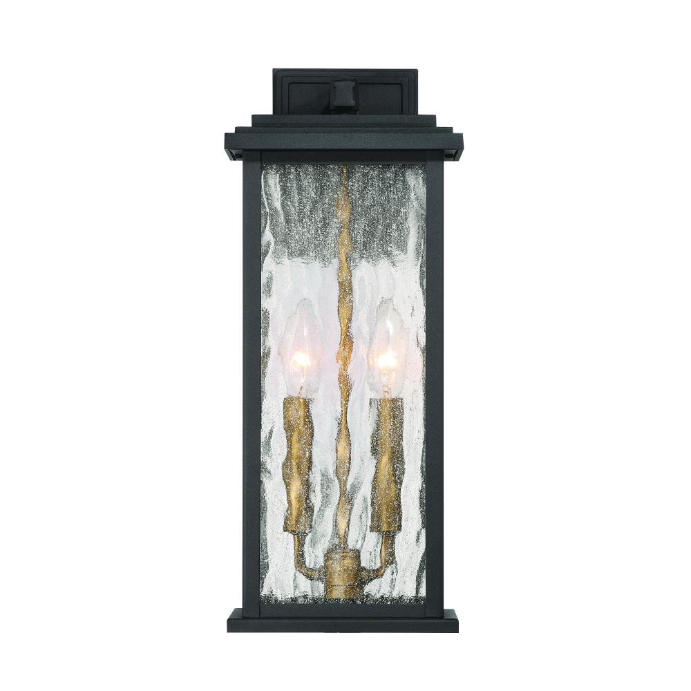 The “Estate” Collection outdoor wall sconce radiates classic allure, with its black metal frame offering a striking contrast to the mesmerizing water glass panels. Encased within, vintage brass candle covers and intricate metalwork glow warmly, evoking a sense of nostalgic charm. Perfect for enhancing any outdoor space, this sconce blends classic sophistication with modern durability.