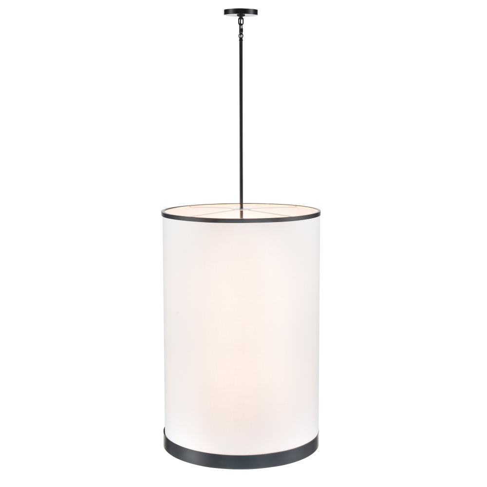 This elegant chandelier from the “High Street” collection, designed by Kevin Kraemer, radiates understated elegance. The hardback linen shade, in a soft eggshell white hue, casts a warm, inviting glow, perfect for elevating any space. Encased in sleek black framing metalwork, the design balances contemporary charm with understated luxury. This model comes with extra rods for any height preference.