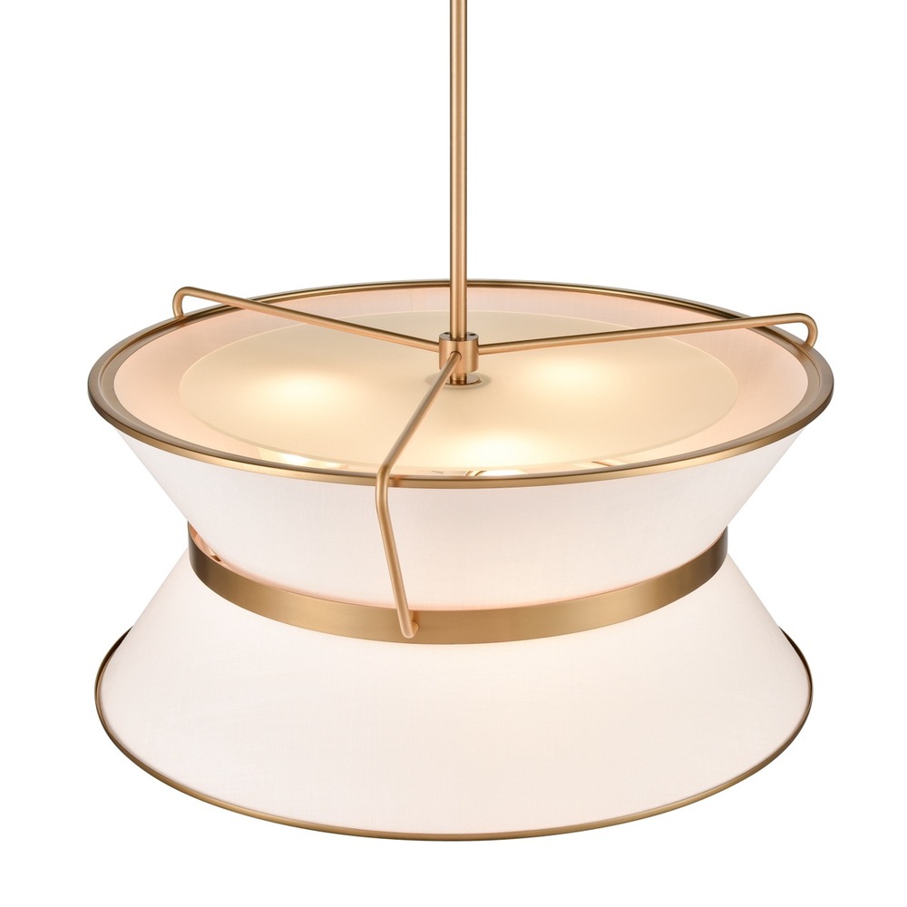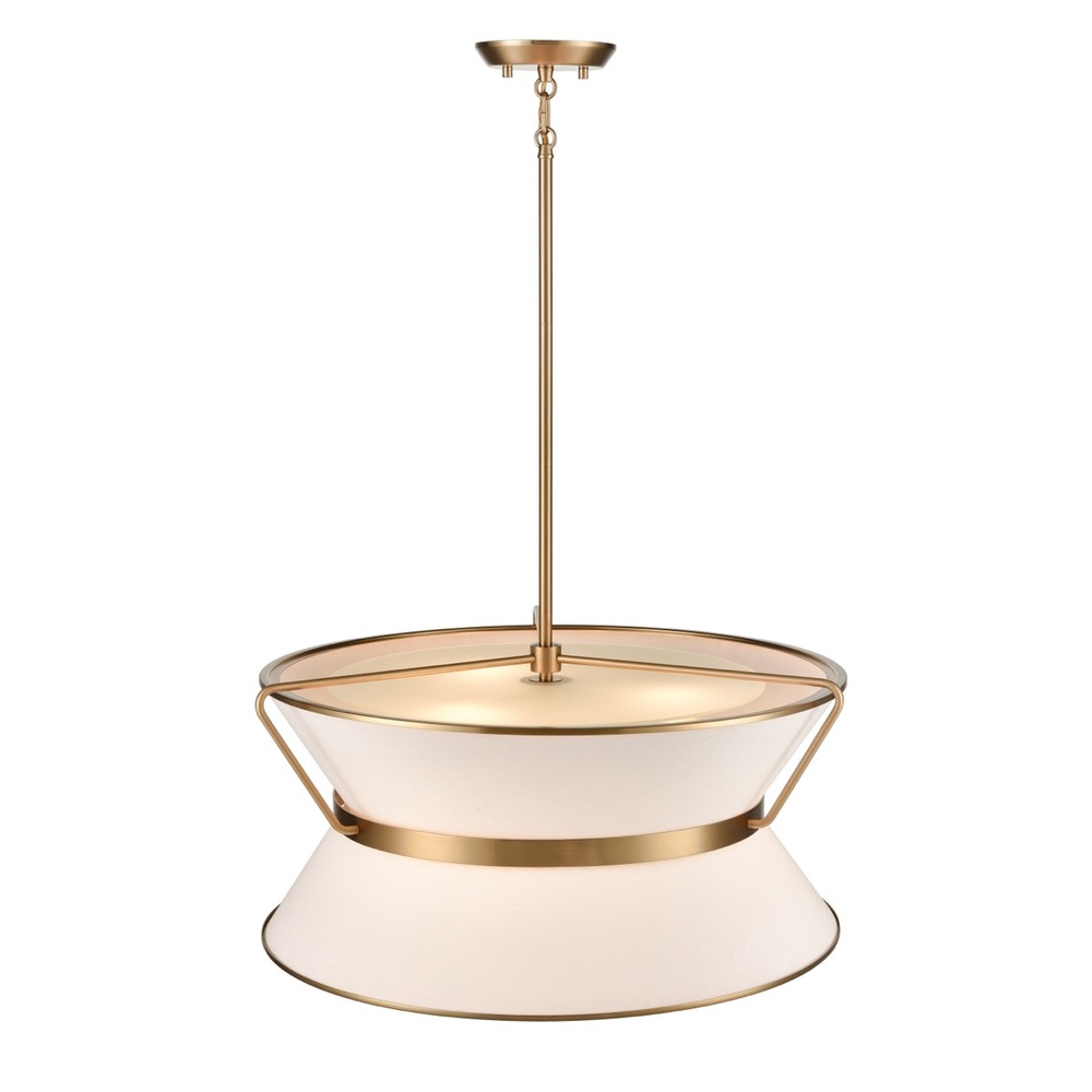 The Layla collection, designed by Kevin Kraemer, features a rich plated brushed brass finished frame, which holds the double linen shades in a unique fashion. The model shown is a single pendant chandelier measuring 23.5" diameter at its largest width. (17" diameter smaller model also available). A stunning fixture for any kitchen or dining room.