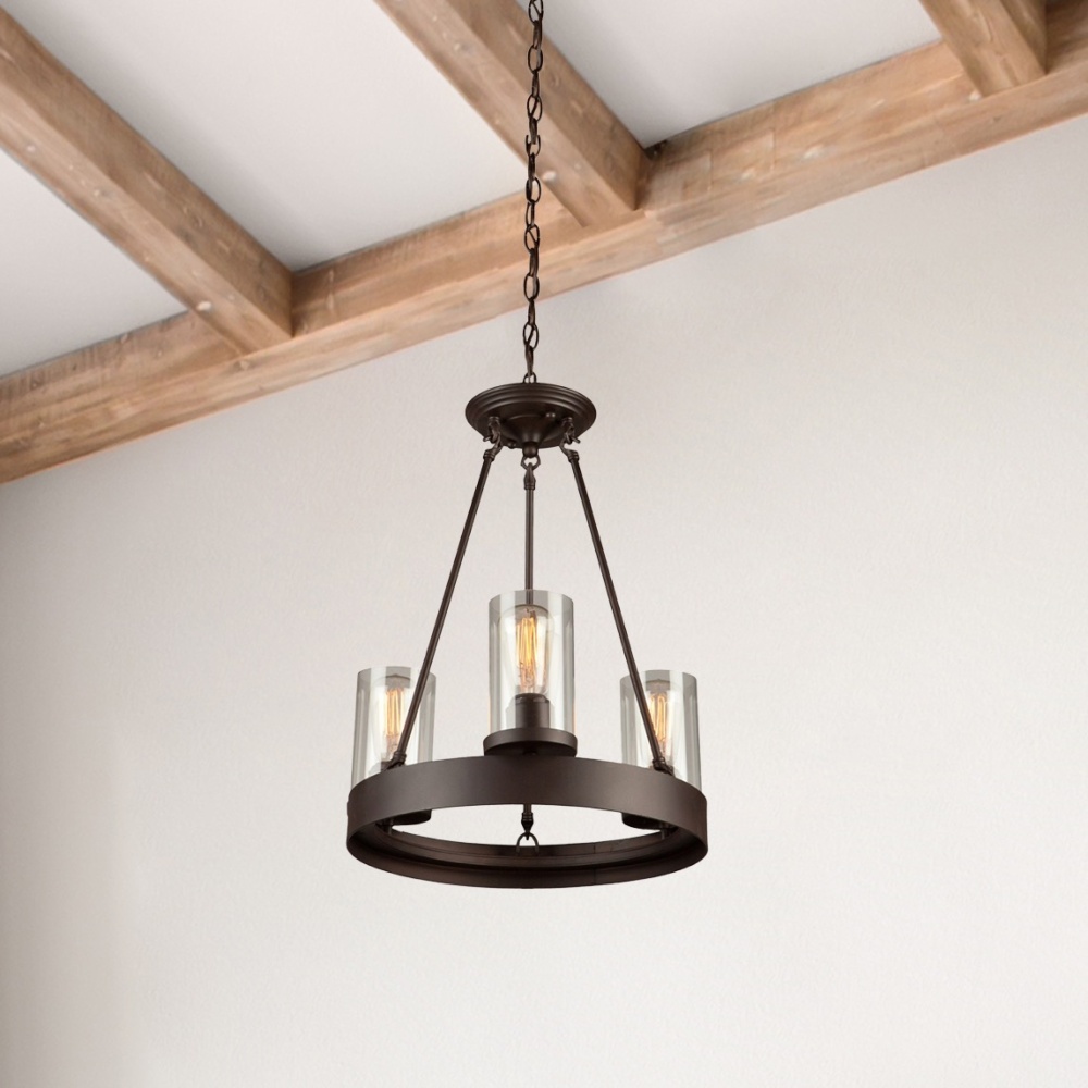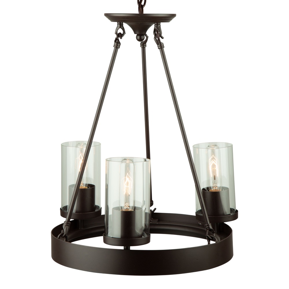 The Menlo Park Collection is painted in a dark chocolate finish, and complimented with a clear cylinder glass. Spherical clean lines throughout gives this collection the status of an instant classic. Shown with Edison filament bulbs to convey the retro look. Tri light mini chandelier