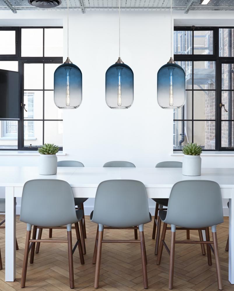 The Omega 12 Pendant is a transitional design composed of a corded transparent steel glass cylinder pendant, with an interesting gradient pattern from top to bottom of the glass. The dramatic play of light through the gradient color is a sophisicated affect, along with the modest display of the lamp filament behind the glass. The cord pendant fixture is equipped with a 10' SVT cordset and a low profile flat monopoint canopy. These stylish and functional luminaries are offered in a beautiful Black finish.
