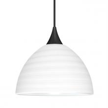 Brella has a classical bell shape that complements aesthetic, while also built for optimal illumination. Our Chalk glass is a soft white opal cased glass that is handcrafted with spiraling strokes of off-white color, emphasizing the subtle brush pattern. The silvery rippled design is subdued and harmonious. Unlit, it appears as simply a textured surface like spun silk, but when lit the texture comes alive. The smooth satin finish on the clear outer layer is a result of an extensive etching process, with the texture of the subtle brushing. This blown glass is handcrafted by a skilled artisan, utilizing century-old techniques passed down from generation to generation. The 12V cord pendant fixture is equipped with a 10' braided coaxial cord with teflon jacket and a low profile flat monopoint canopy. These stylish and functional luminaries are offered in a beautiful Black finish.