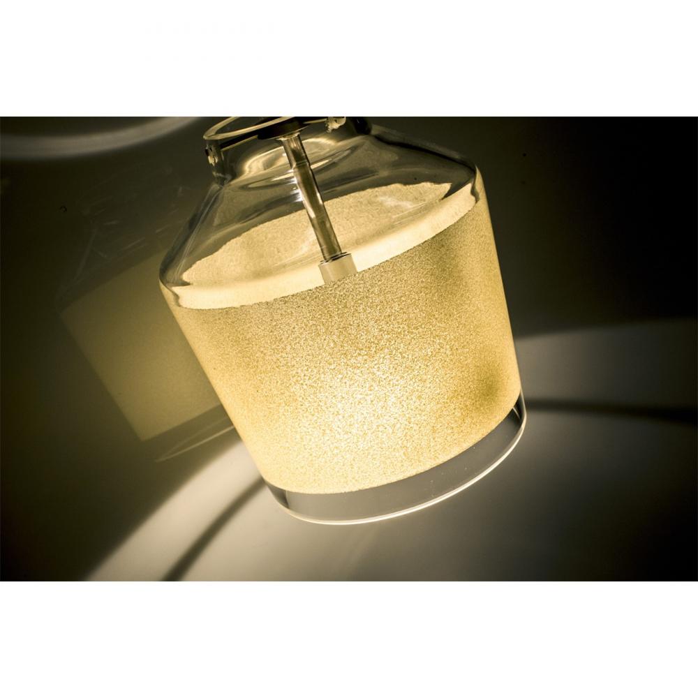 Pica 6 is a compact tapered glass with a broad angled top and a chamfer-cut bottom, its retro styling will gracefully blend into today's environments. The Creme Sand décor begins with a clear blown glass, with glossy outer finish. We then, using a handcrafting technique, carefully apply a band of actual fine-grained sand to the inner surface of the glass, where white colour is fully saturated into the coating for a bold statement. A final clear protective coating is applied to seal and preserve the accent material. The result is a beautifully tetured work of art, comfortable with the irony of sand being applied to a glass that orinates from sand. When illuminated, the colors shimmers through the noticeable refractions created by every granule, as the sand patterning is obvious and pleasing. The 12V cord pendant fixture is equipped with a 10' braided coaxial cord with teflon jacket. These stylish and functional luminaries are offered in a beautiful Black finish.