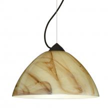 Tessa has a classical bell shape that complements aesthetic, while also built for optimal illumination. Our Mocha glass is a pressed glass that features a cream color that is marbleized with brown. This décor is classic and can be used in various ways. When lit this gives off a light that is functional and soothing. The smooth satin finish on the clear outer layer is a result of an extensive etching process. This handcrafted glass uses a process where every glass is consistently produced using a press mold, keeping variations to a minimum. The cable pendant fixture is equipped with a 10' silver aircraft cable and AWM cordset, and a dome monopoint canopy. These stylish and functional luminaries are offered in a beautiful Black finish.