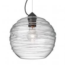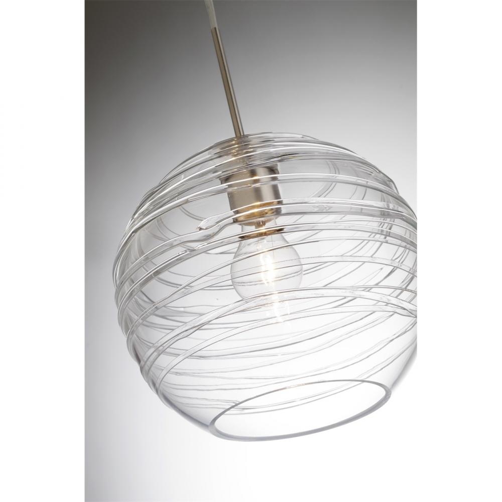 The Wave is a globe-shaped clear glass, with a romantic wrap of glass rope that spirals around the exterior. The clear blown glass is contemporary yet timeless, and will suit any classic or modern decor. When lit, the clear glass shimmers and sparkles with the accents from the light source. This blown glass combination is handcrafted by a skilled artisan, utilizing century-old techniques passed down from generation to generation. The cable pendant fixture is equipped with a 10' silver aircraft cable and AWM cordset, and a dome monopoint canopy. These stylish and functional luminaries are offered in a beautiful Black finish.