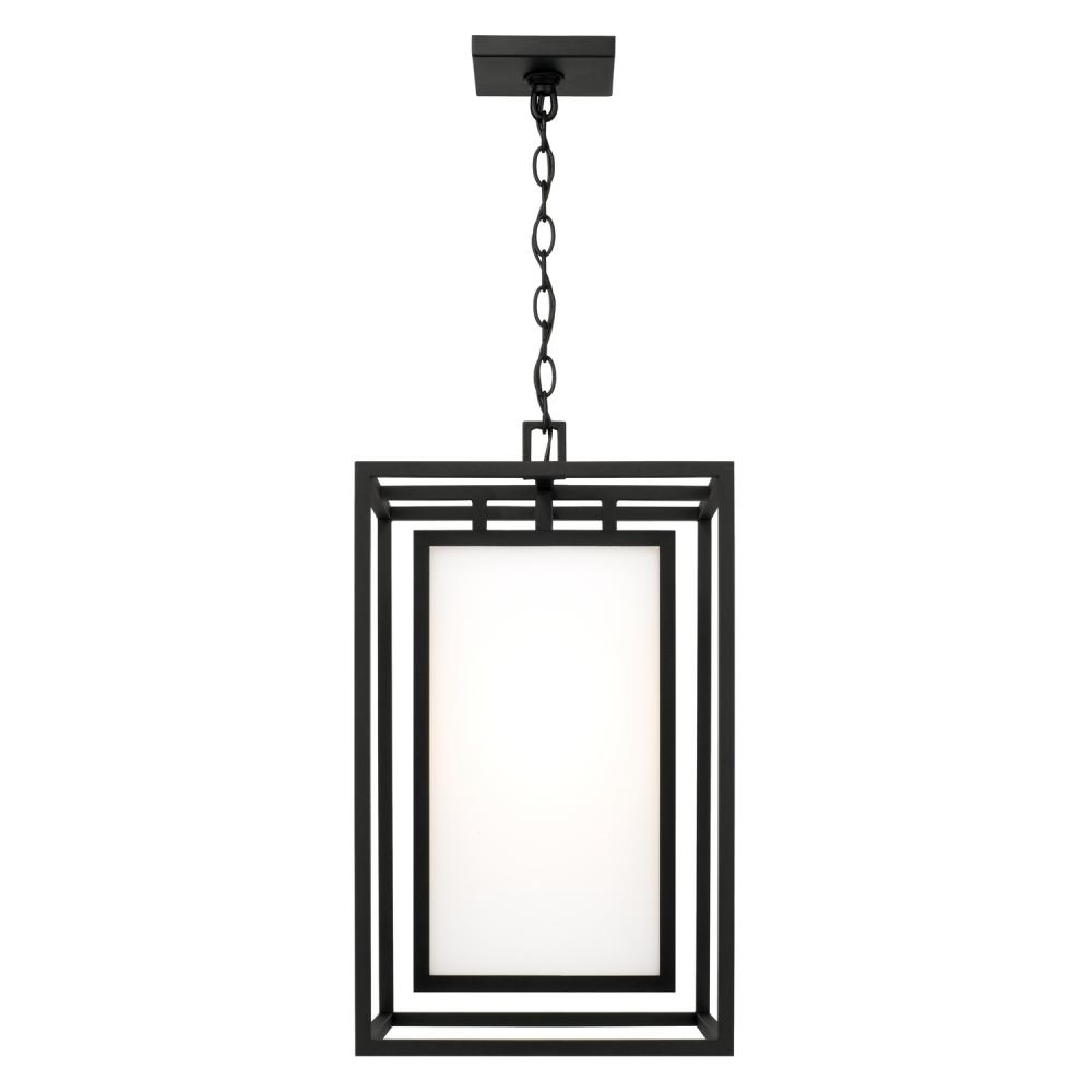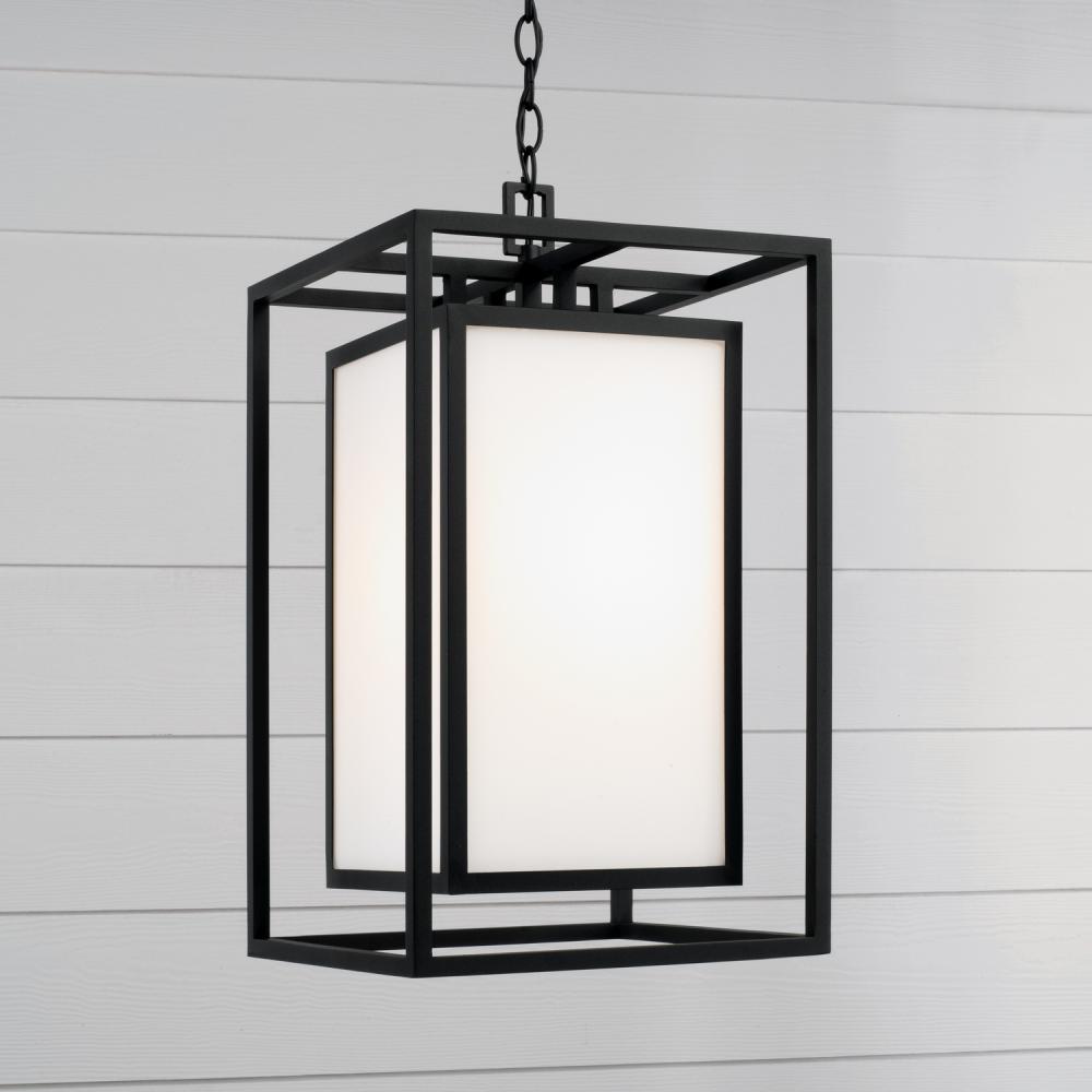 Neat and contemporary, the Aiden Outdoor Hanging Lantern creates the illusion of floating light with inner and outer rectangular forms. The Soft White glass panes cast a warm glow to perfectly complement the squared silhouette, while the Black finish delivers a distinct aesthetic. Part of our Rain or Shine Series and backed by our five-year warranty.