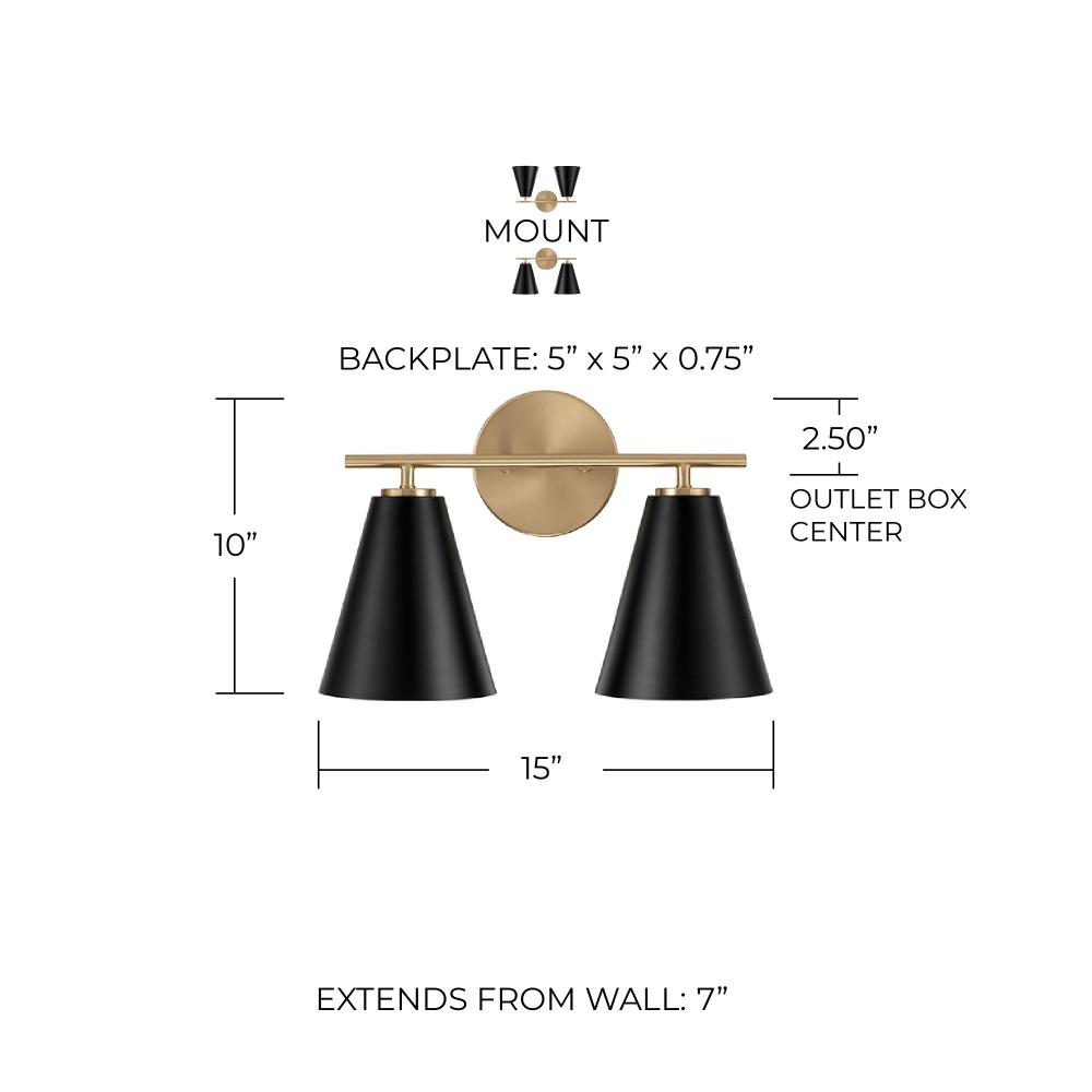 Featuring sleek metal shades and Matte Brass details, the Charlie 2-Light Vanity punctuates any powder room. The cone shape paired with the Matte Black finish delivers classic style all around.