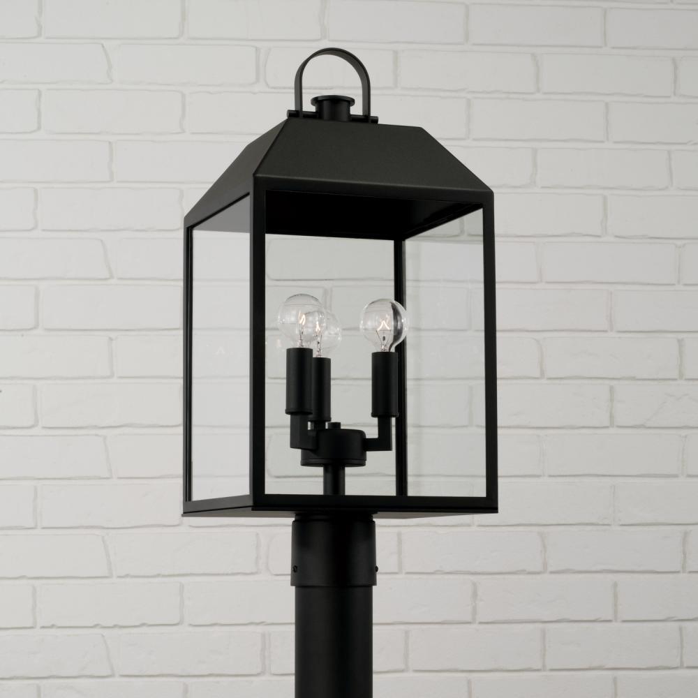 The Nelson Post Lantern seamlessly blends modern style with traditional details. The clear glass panes are framed by the rectangular forms for a distinct aesthetic, rounded out with the arched ring and knob on top, all in our signature Black finish. Part of our Rain or Shine Series and backed by our five-year warranty.