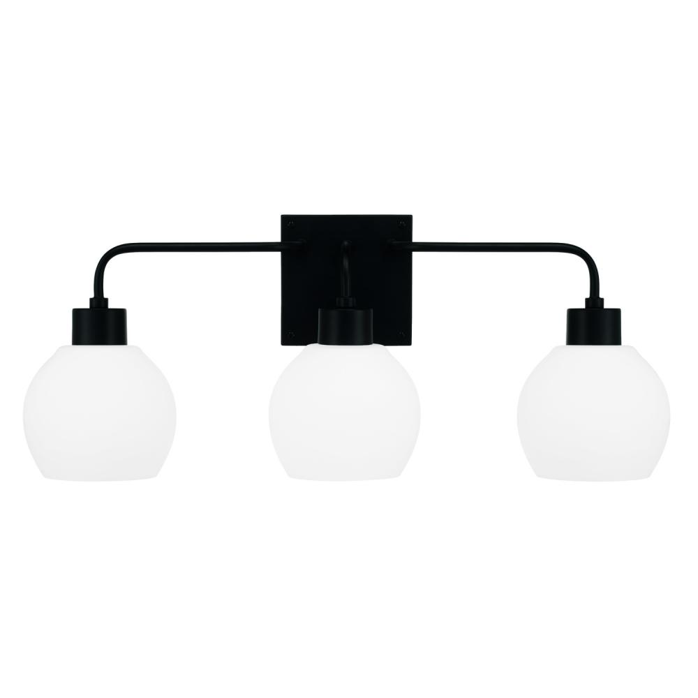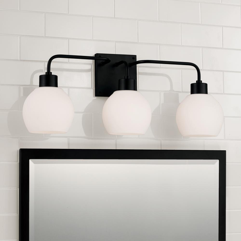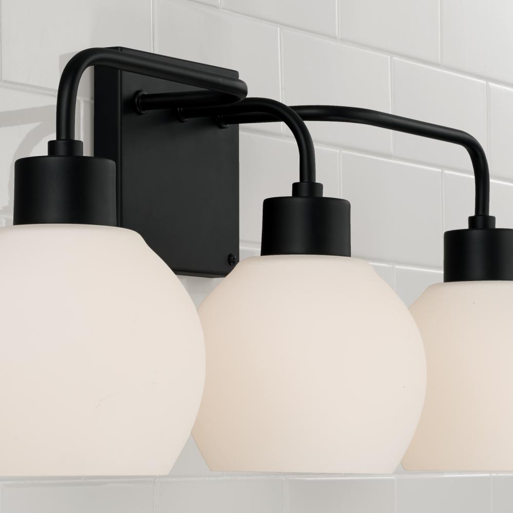 24.5"W x 9.75"H 3-Light Vanity in Matte Black with Soft White Glass Globes