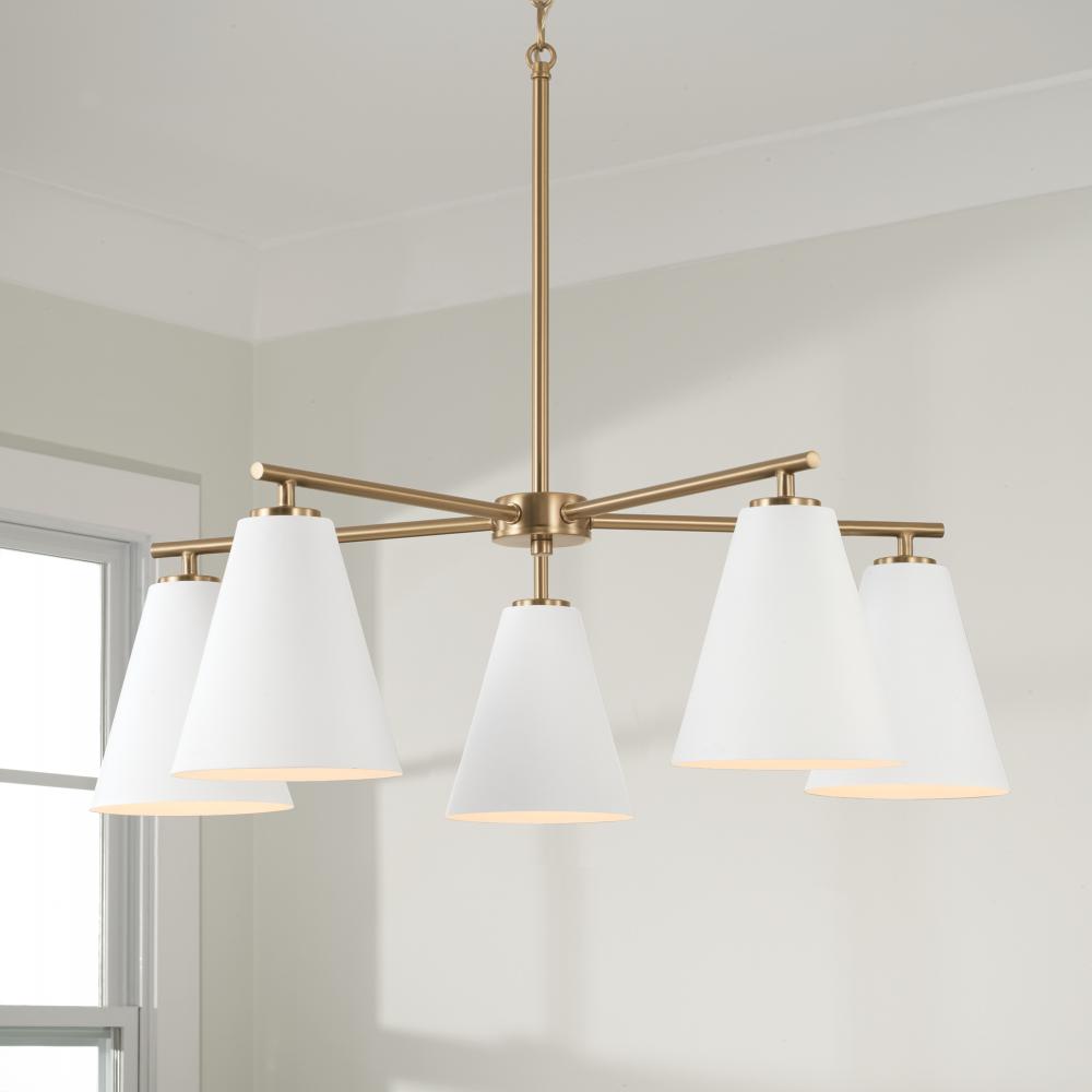 Featuring sleek metal shades and Matte Brass details, the Charlie Chandelier punctuates any space. The cone shape paired with the Matte White finish delivers classic style all around.