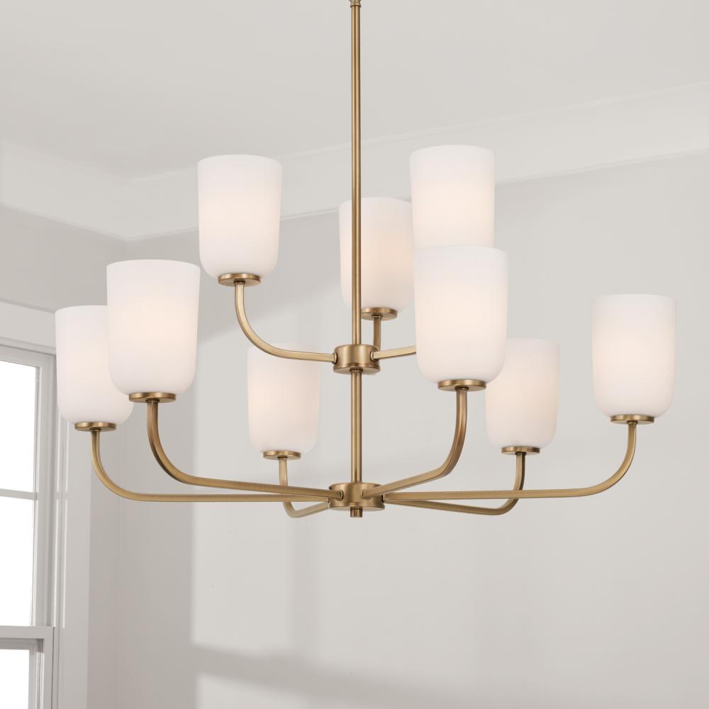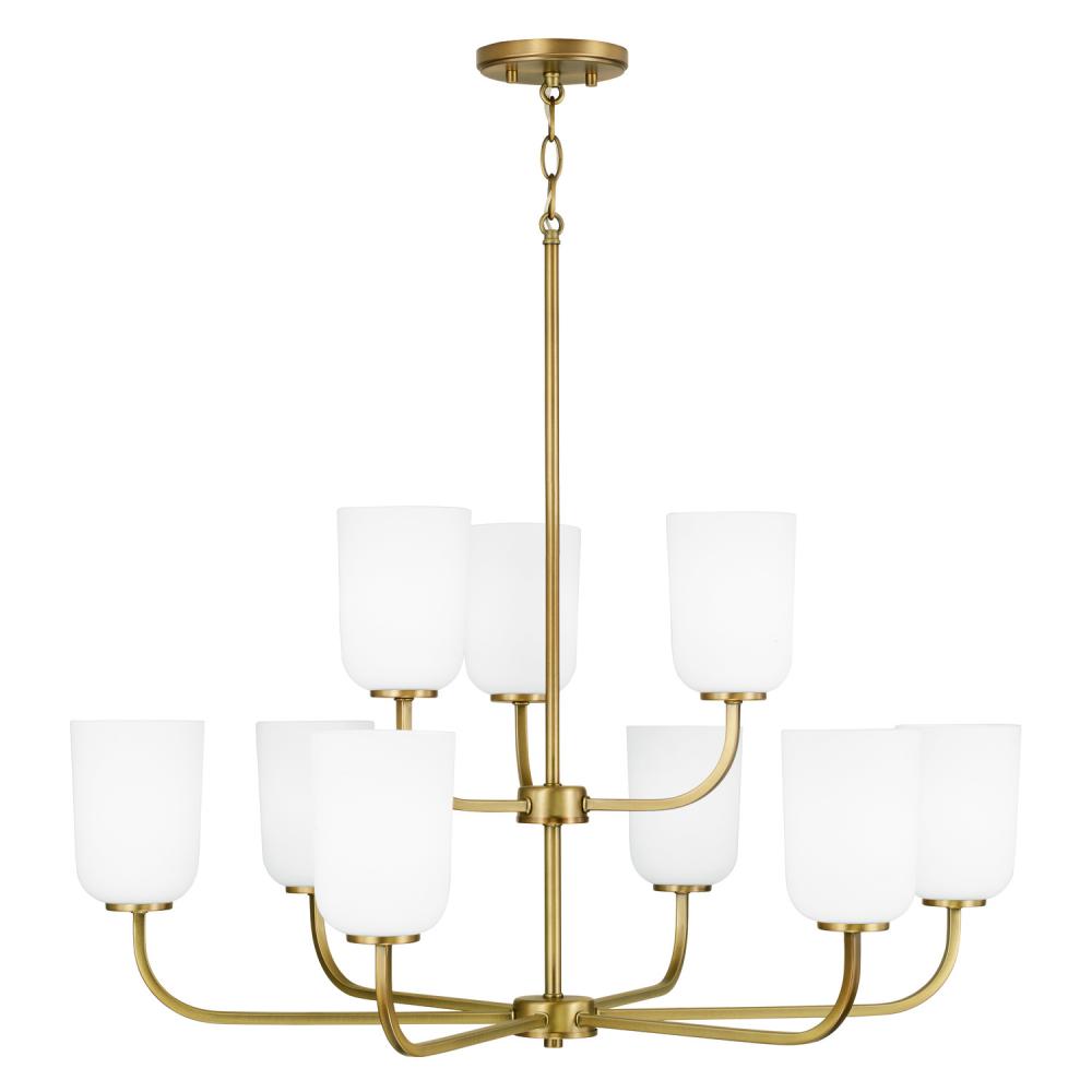 32"W x 26.75"H 9-Light Chandelier in Aged Brass with Soft White Glass
