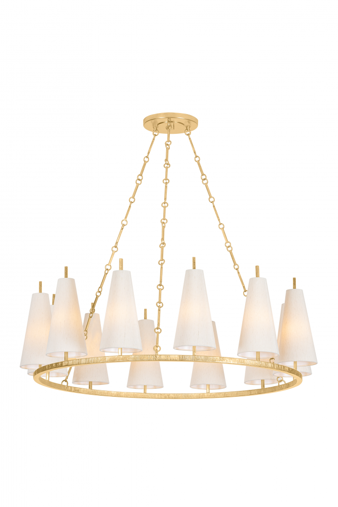 While simplistic, the natural silk shades and circular motifs of the Tirana family nod to a nautical spirit. The conical shades provide a contemporary lightness to the traditional silhouettes. By contrast, the delicately textured Vintage Gold Leaf metalwork catches the light like a modish bangle bracelet. Available as a 1-light sconce and a 12-light, 15-light, and 27-light chandelier, Tirana produces warm, refined lighting for transitional spaces.