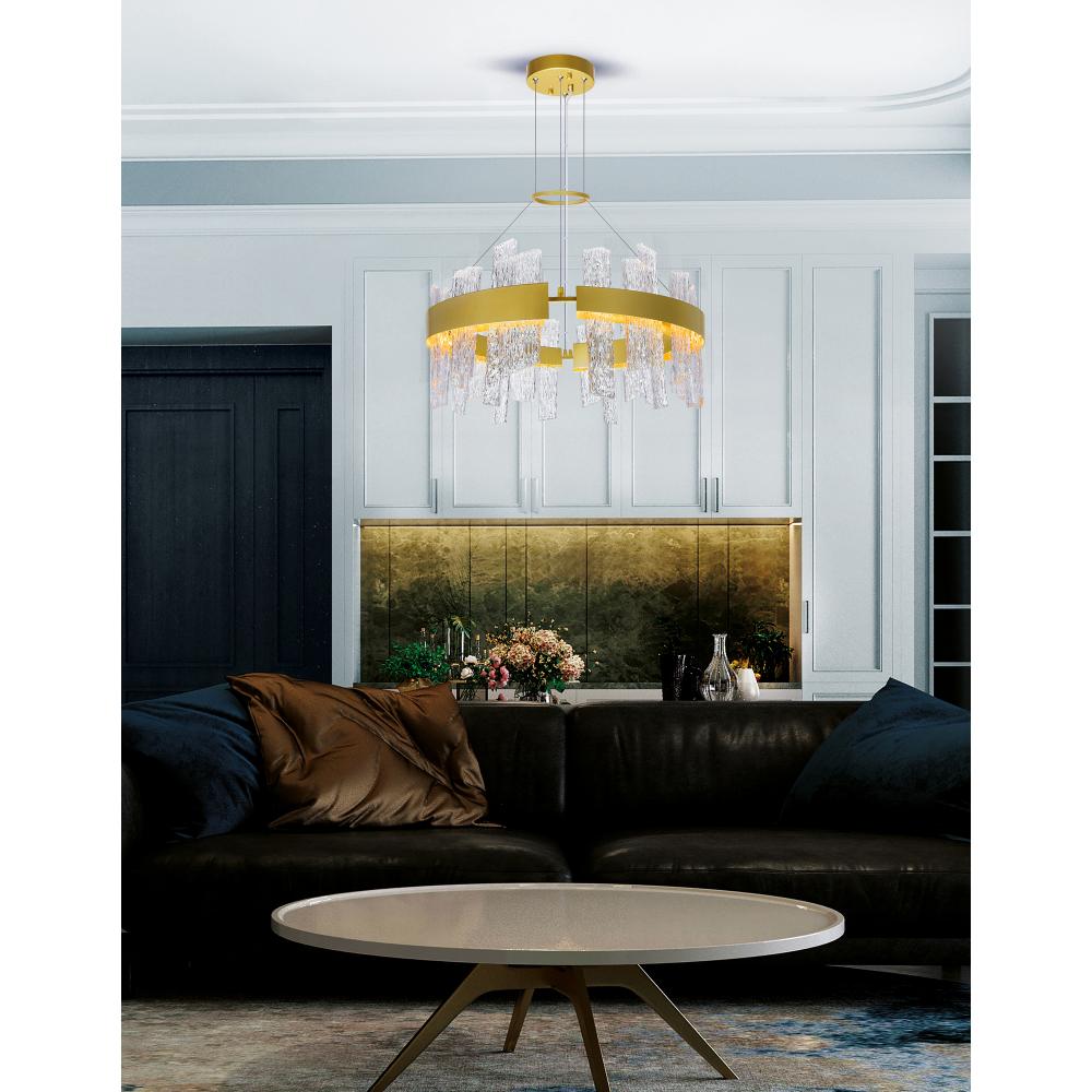 Add an instant dose of modern luxury to your space with the Guadiana 24'' Round Modern LED Chandelier in Satin Gold. Designed with a sleek satin gold frame and adorned with clear textured glass panels, this sculptural chandelier brings visual harmony through the interplay of linear and curved forms. Integrated LEDs deliver ambient lighting that's both functional and efficient, making this chandelier ideal for the dining room, foyer, or living area. Its timeless design and bold finish create a dramatic focal point in any modern setting. Finish: Satin Gold Light Count: Integrated LED Light Source: LED, No Bulb Required Adjustable Hanging Height: Yes Material: Metal & Textured Glass Style: Modern / Contemporary