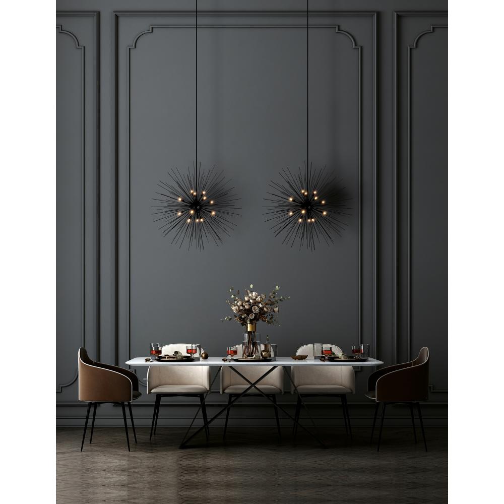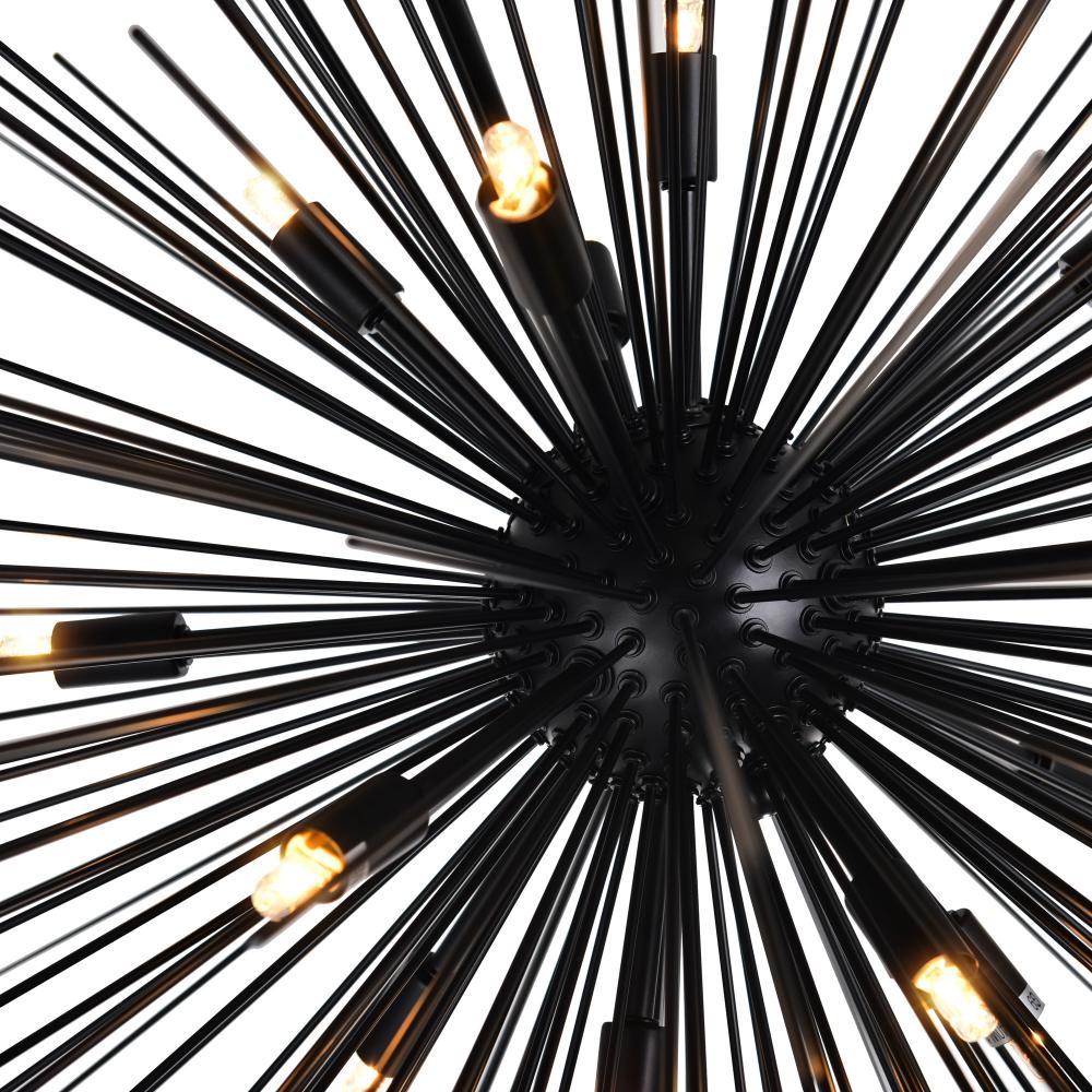 Add bold character to your space with the Savannah 14 Light Chandelier in a sleek black finish. Featuring a striking 40-inch diameter starburst design, this chandelier makes a dramatic statement in any room. Perfect for creating a warm, captivating glow, its ideal for brightening up modern, minimalist spacesespecially when paired for double the impact.