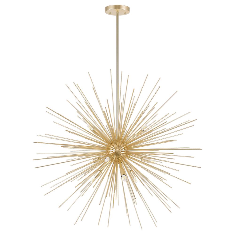 Add bold character to your space with the Savannah 9 Light Chandelier in a gold leaf finish. Featuring a striking 30-inch diameter starburst design, this chandelier makes a dramatic statement in any room. Perfect for creating a warm, captivating glow, its ideal for brightening up modern, minimalist spacesespecially when paired for double the impact.