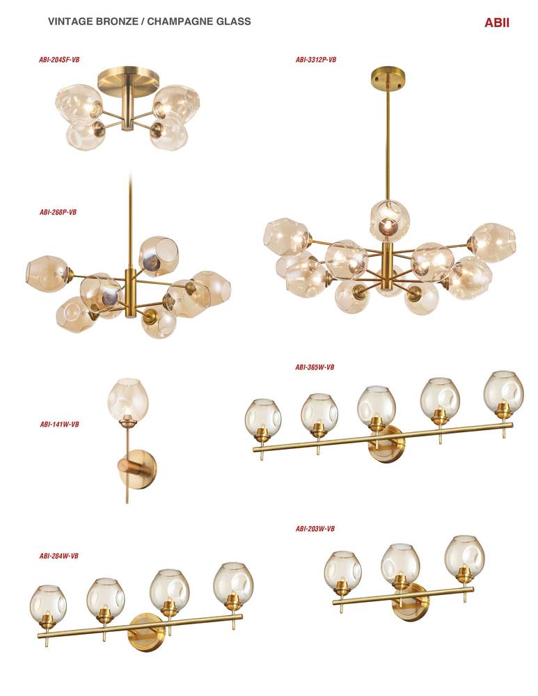 The eye-catching contrast of glass globes and sleek straight lines form the basis of the ABII family of lighting fixtures. It's a versatile and adaptable design with options ranging from a single sconce to a large pendant light in a look that can work with virtually any room or design scheme. The metal base and arms create a pattern to showcase the reflective effects of the glass globes. Colorway options include complementary finishes from warm to stylishly dramatic. Halogen lights add a warm glow. From ultra-modern minimalism to mid-century and even more traditional décors, the ABII family of lighting’s transitional design is both luxurious and timeless in its appeal.
