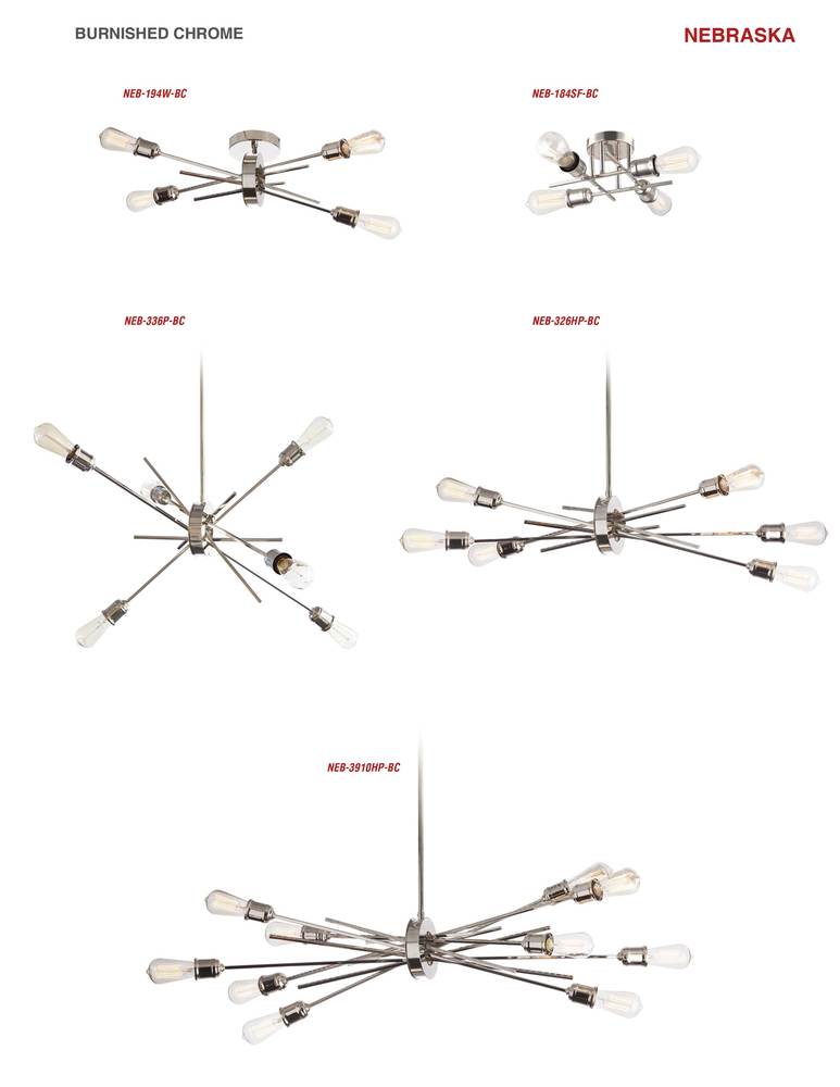 Adventurously stylish, the Nebraska family of lighting is inspired by the wide open spaces of the prairie state. The expansive design comes in a choice of configurations oriented vertically, horizontally or in all directions. A metal frame in a choice of gleaming finishes houses the arms that radiate out from the center. The bulbs emanate light from the end of each arm in a variety of intriguing patterns. With all its possible configurations, Nebraska lighting will add a focal point to any room from the living or great room to a dinette or hallway.