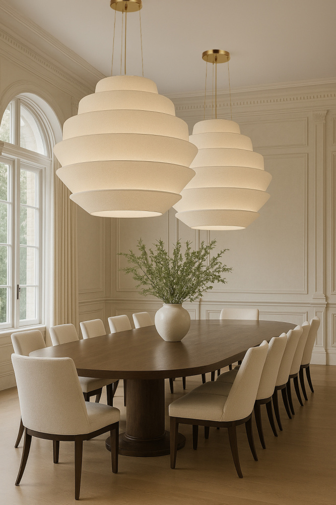 9 Light Incandescent Aged Brass Pendant with Boucle Fabric Shade