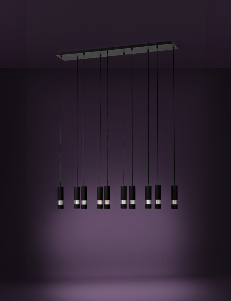 10 LT LED Linear Pendant w/ Black Finish & Black Cylnder Shades & Clear Seeded Diffusers