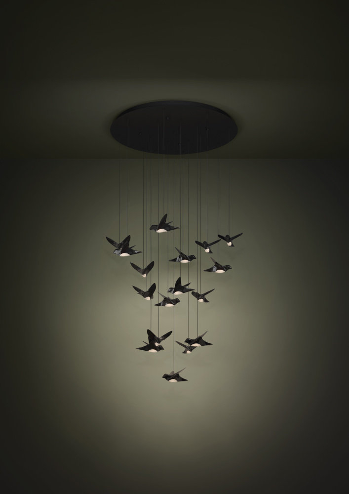 17 LT LED Casade Pendant w/ Black Finish & Black Chrome Bird Shaped Shades