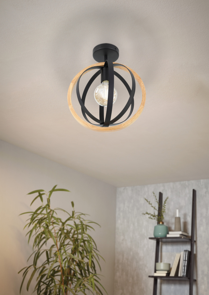 1 LT Ceiling Light w/ Black Finish & Black Metal & Wood Shade