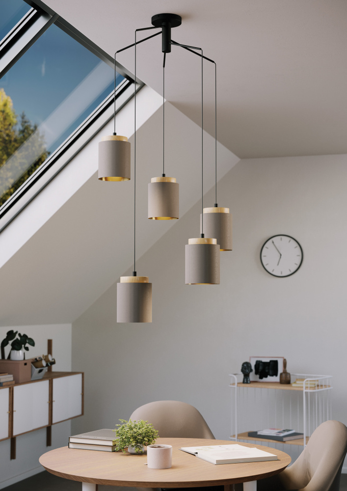 5 LT Cascade Pendant w/ Black Finish & Cappucino & Gold Shades w/ Wood Accent