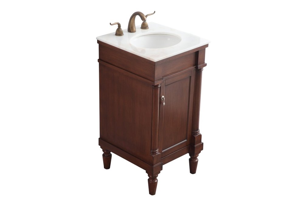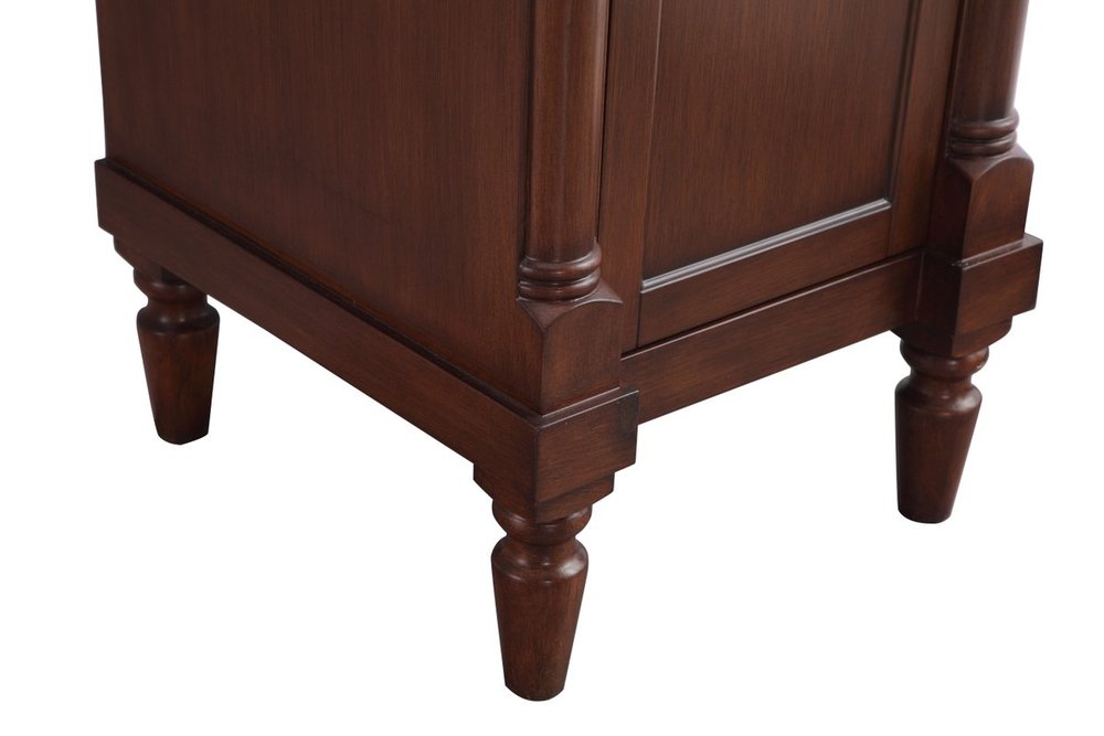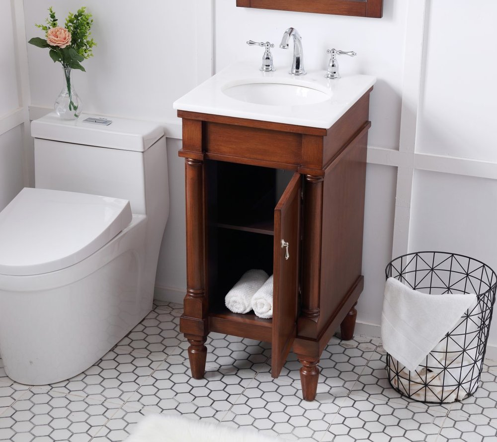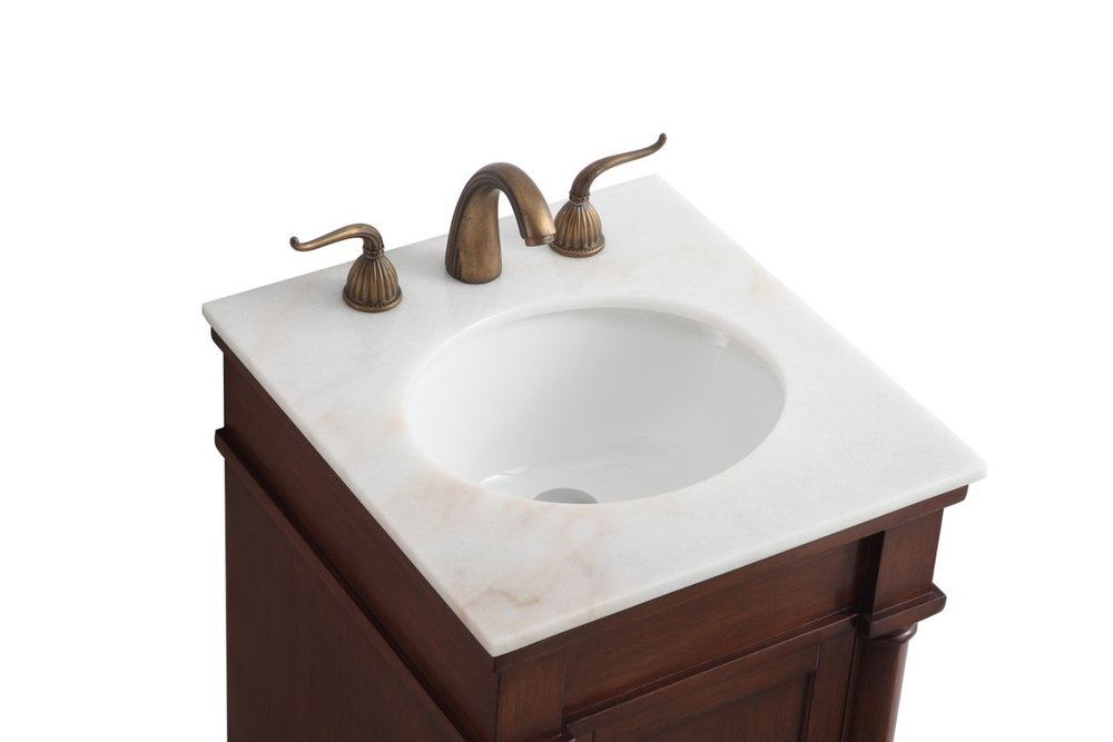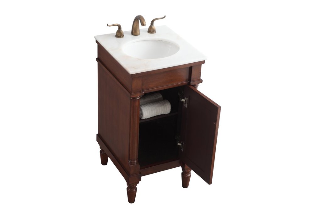 This traditionally styled, yet fashionably designed vanity can add distinction and grace to your home or office bathroom. Beautifully combining a lustrous white marble countertop with an oval white porcelain under-mount sink and a hand-painted walnut Single door cabinet with a shelf inside, brushed steel door pulls, standing on turned, tapering legs. You’ll enjoy its charming allure for many years to come. Measurements: W18” x D19” x H35”