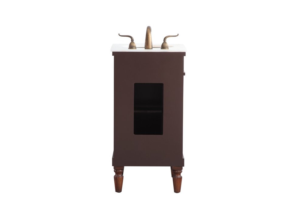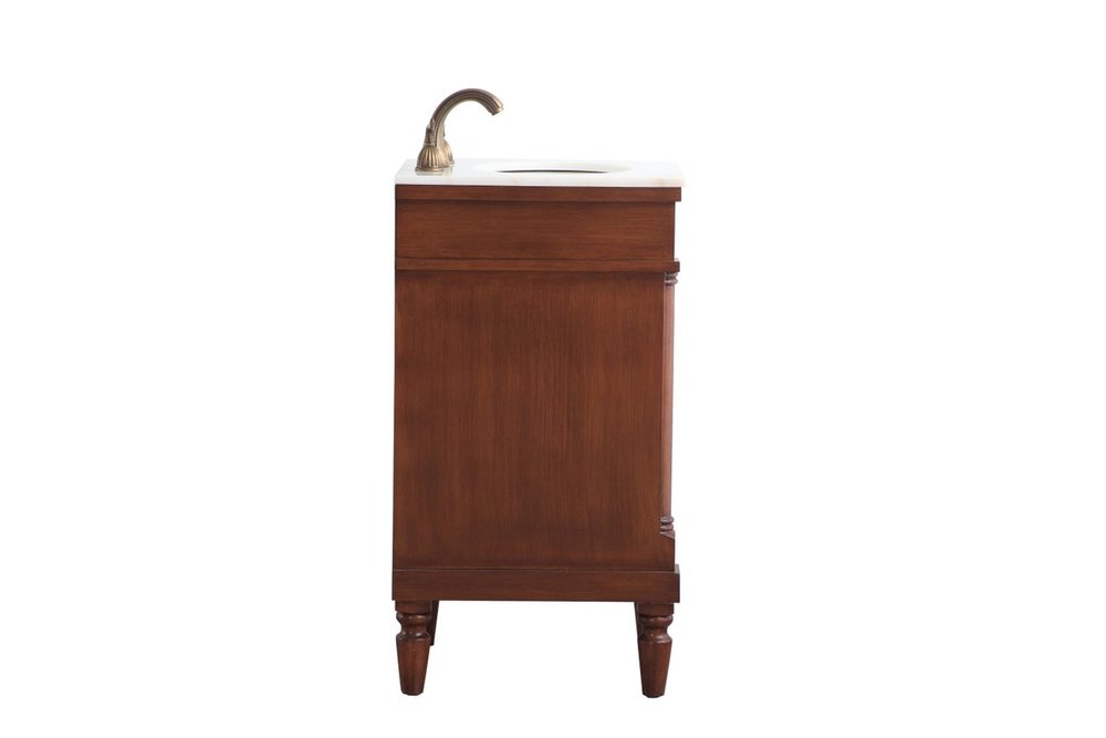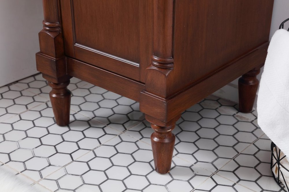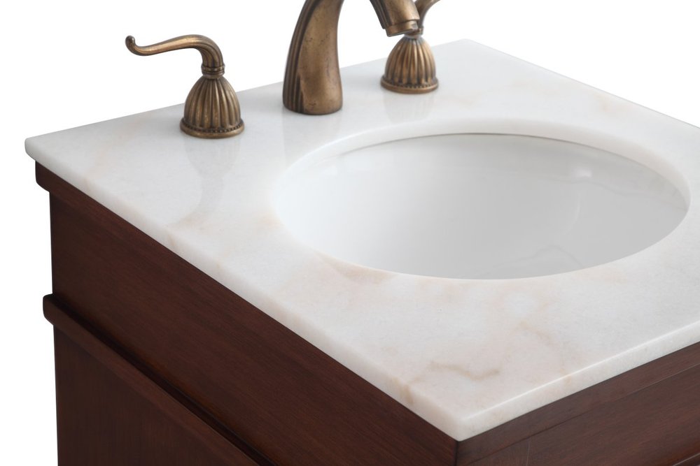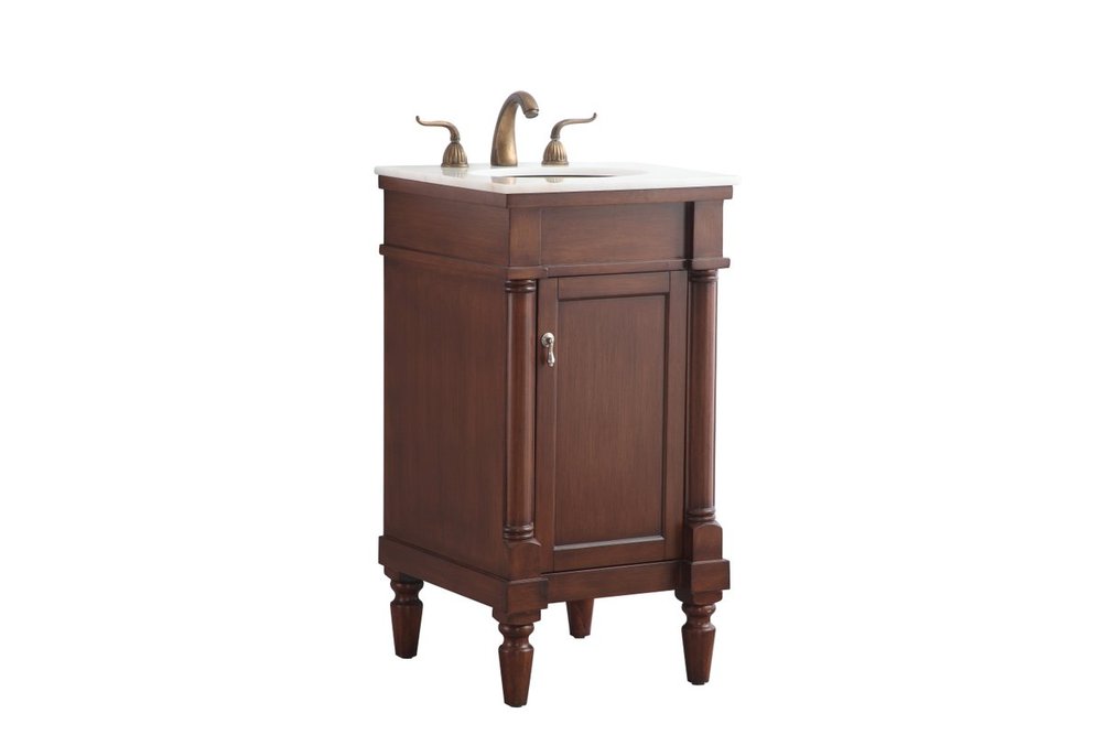 This traditionally styled, yet fashionably designed vanity can add distinction and grace to your home or office bathroom. Beautifully combining a lustrous white marble countertop with an oval white porcelain under-mount sink and a hand-painted walnut Single door cabinet with a shelf inside, brushed steel door pulls, standing on turned, tapering legs. You’ll enjoy its charming allure for many years to come. Measurements: W18” x D19” x H35”