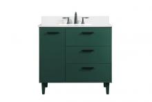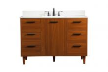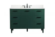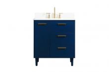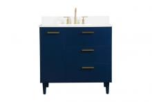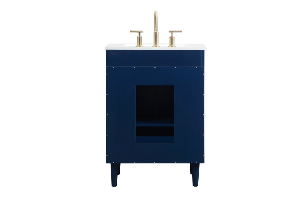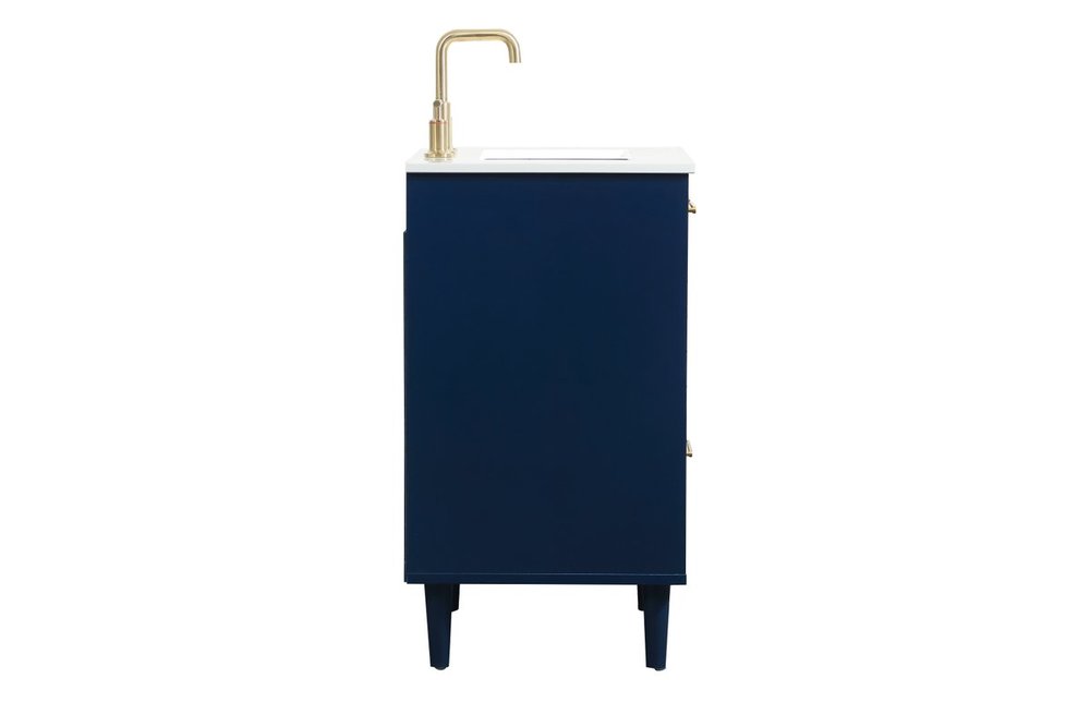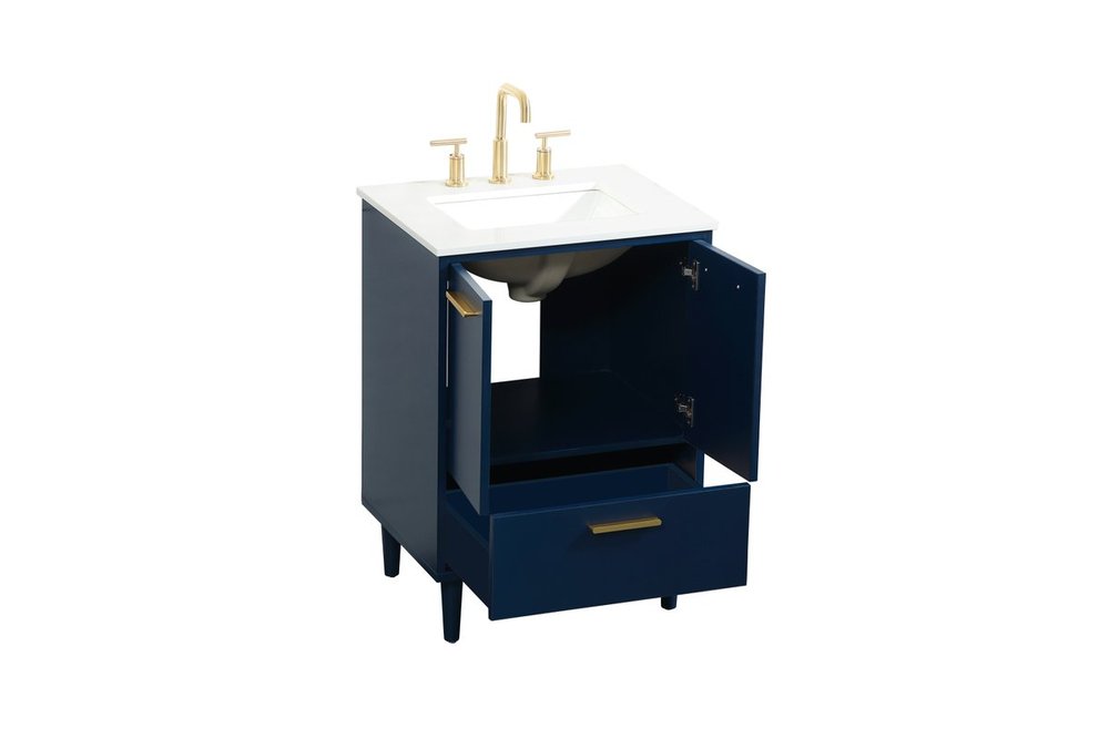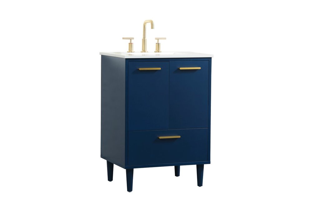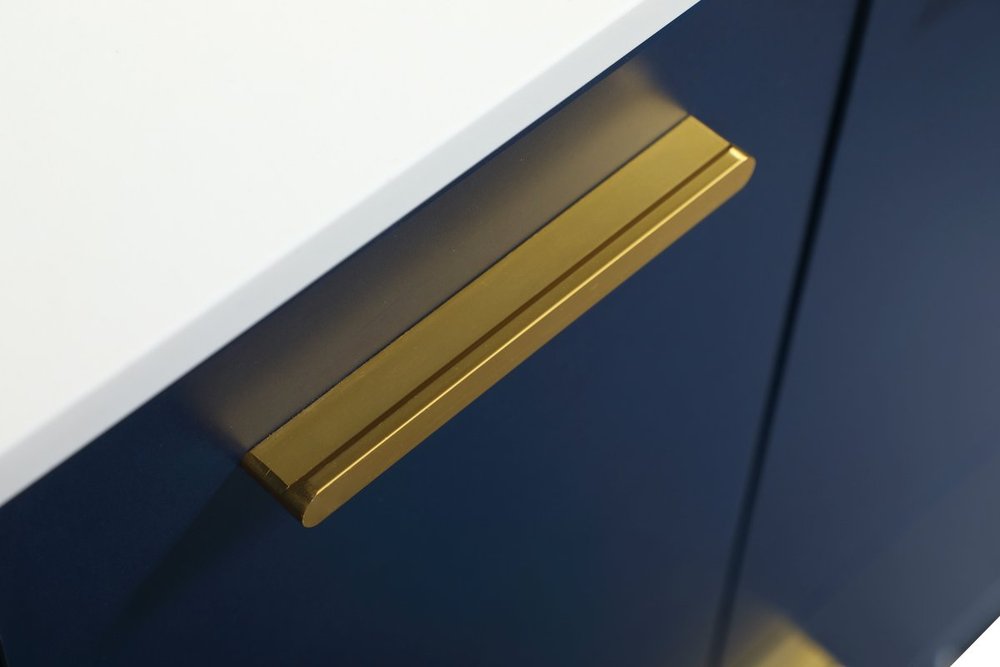Modern sophistication is defined with the blue finish and gold barpulls of this vanity and slender tapered legs. Its length makes it the perfect addition to any sized home, and saves space with its storage area hidden behind the double cabinet doors and one bottom drawer. Topped with a highly durable engineered stone countertop and a porcelain undermount sink, this modern design will become your focal point of your bathroom or powder room. Equipped with soft-closing drawer and doors adds a quiet functional touch.