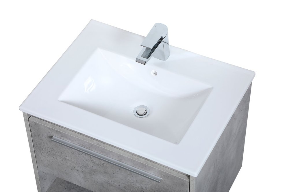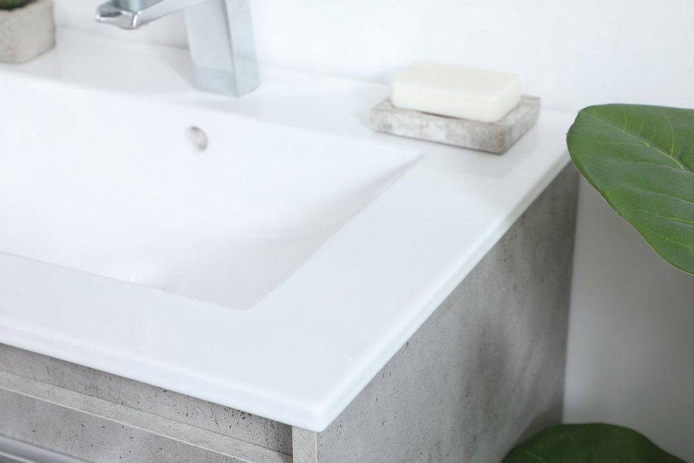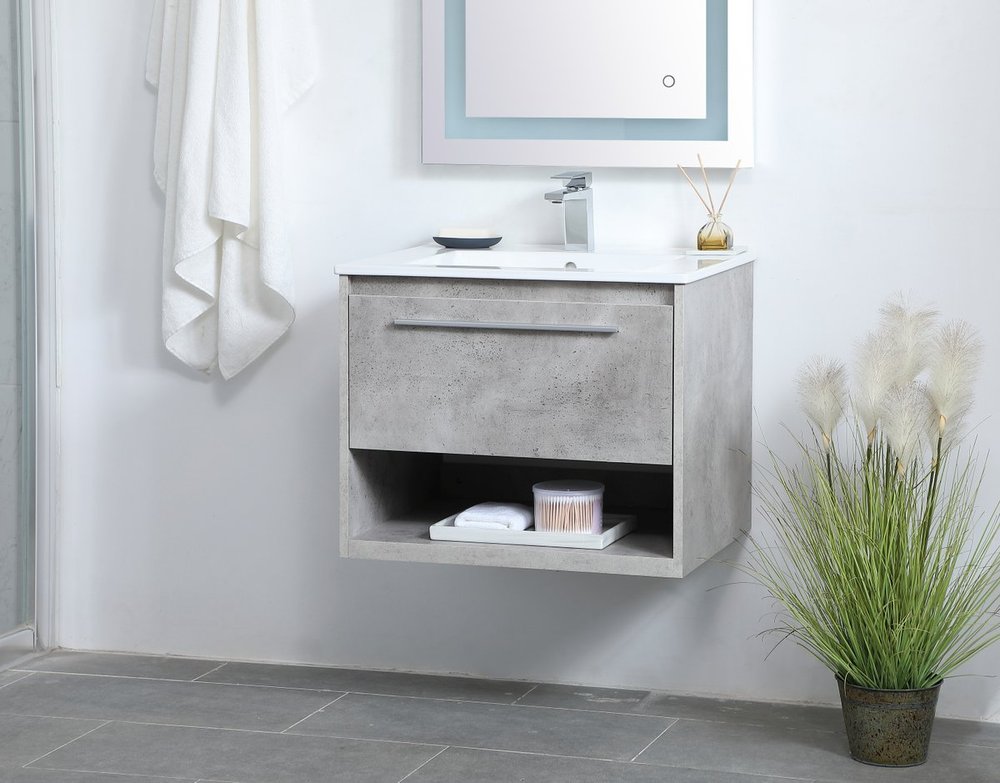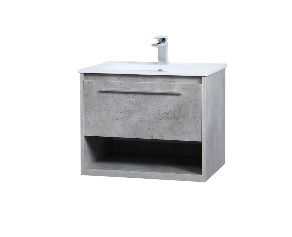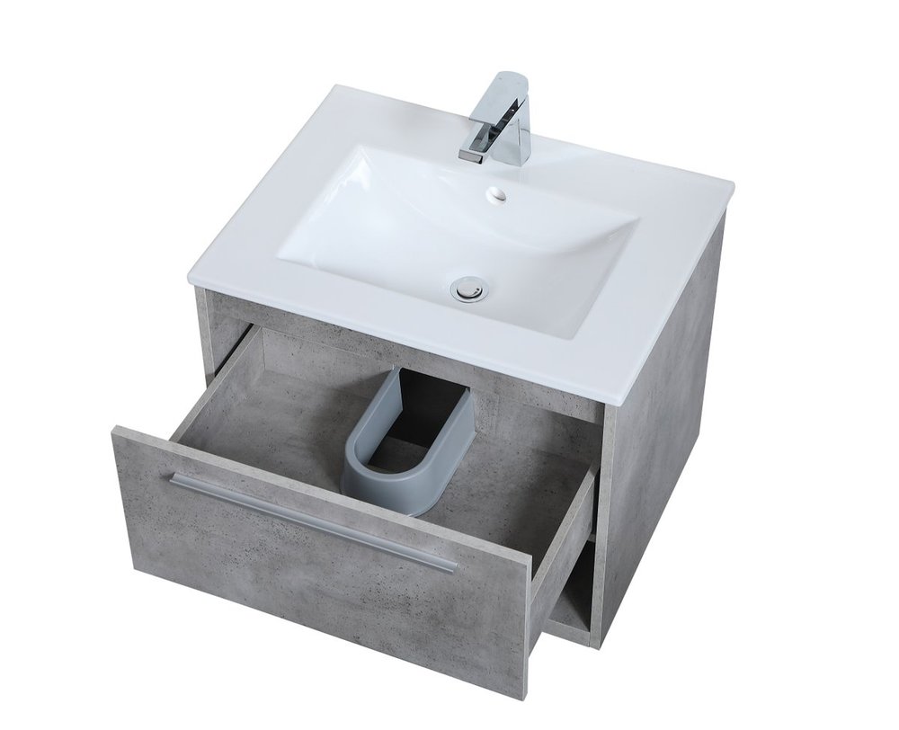 Save space and make your bathroom appear bigger with this 24" floating vanity in a concrete grey finish. Its minimal design will have you in awe, while its clean lines will leave your room feeling fresh and uncluttered. The Single u-drawer pulls out for storage while the open space below allows you to place extra towels or various other essentials.