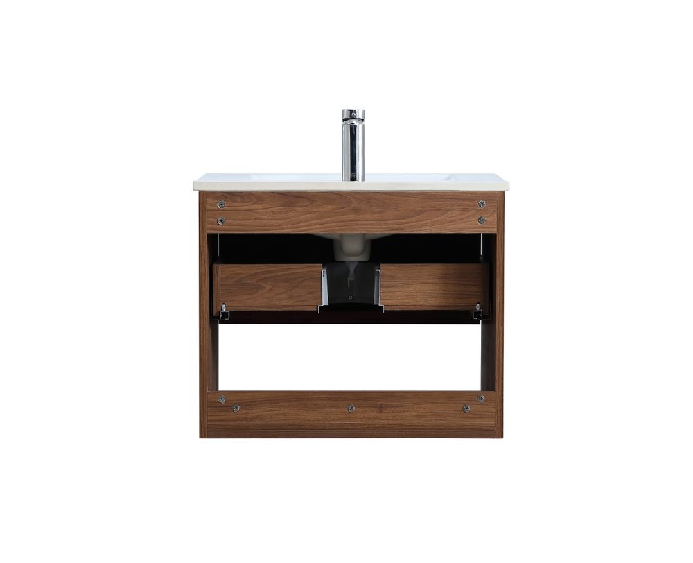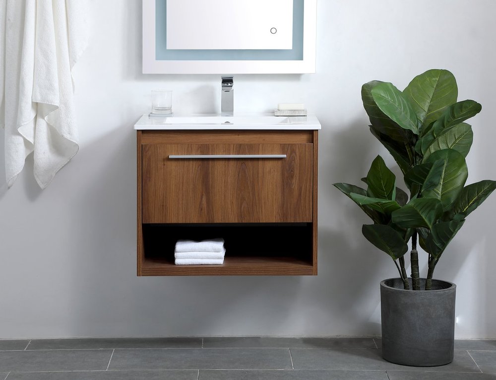 Save space and make your bathroom appear bigger with this 24" floating vanity in a walnut brown finish. Its minimal design will have you in awe, while its clean lines will leave your room feeling fresh and uncluttered. The Single u-drawer pulls out for storage while the open space below allows you to place extra towels or various other essentials.