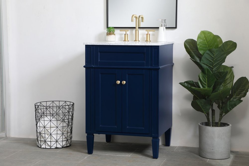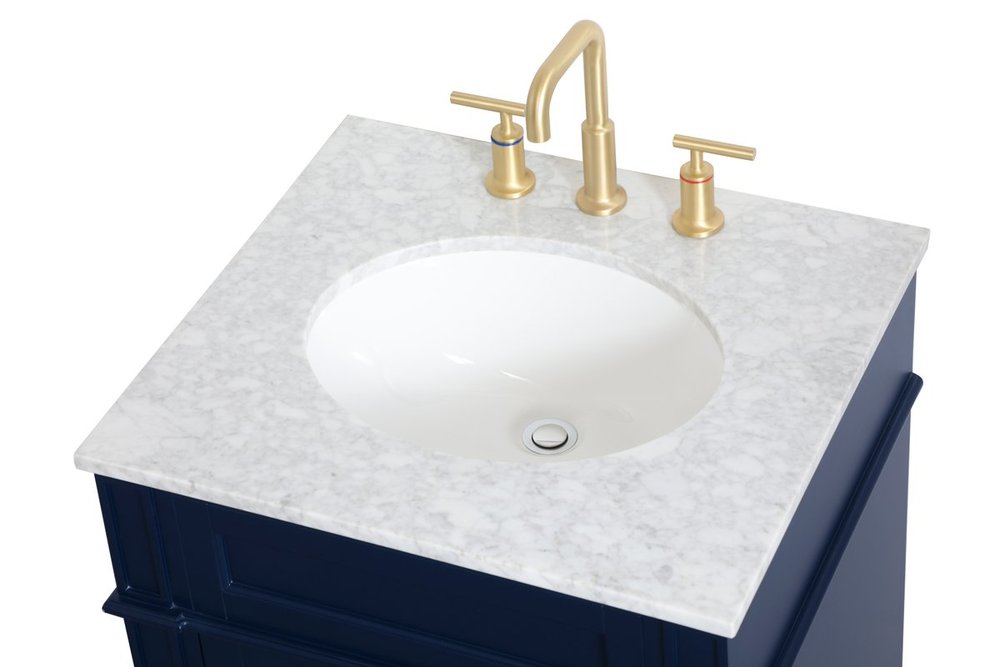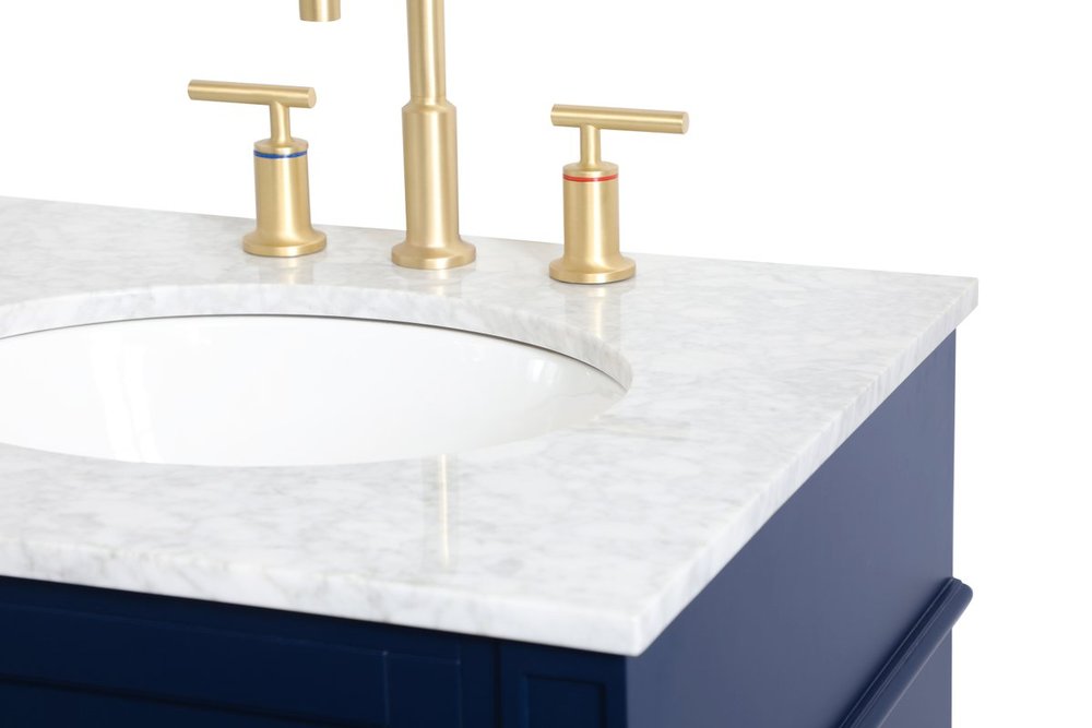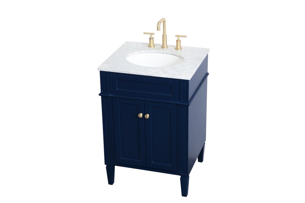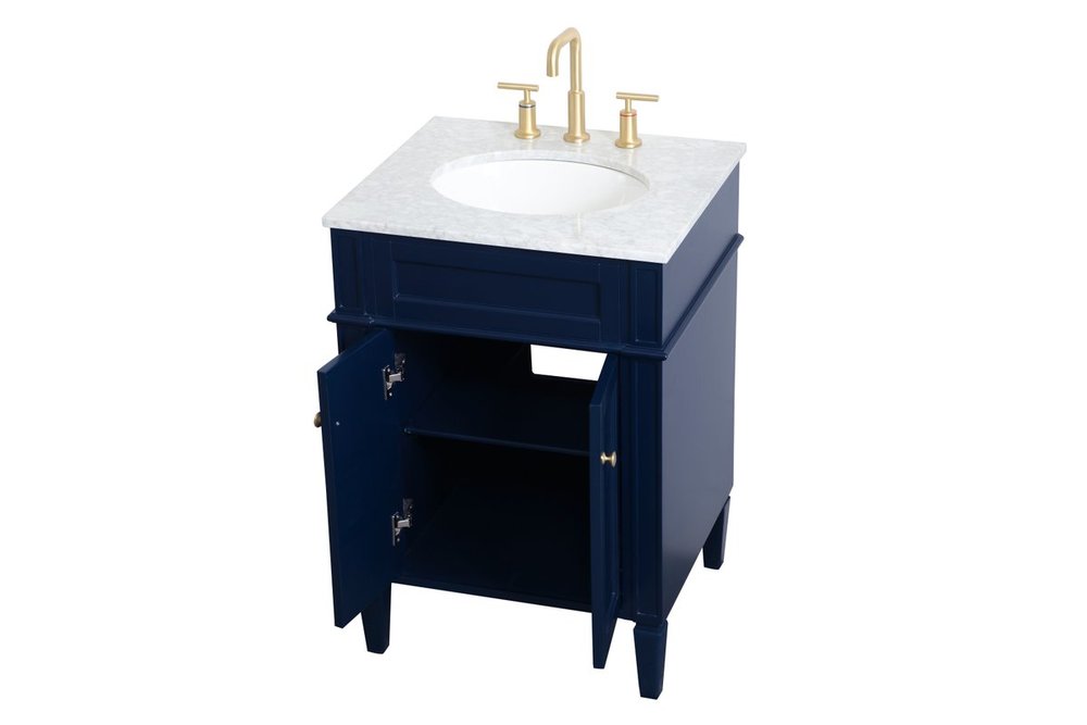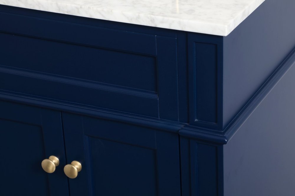 Modern sophistication is defined within the urbane blue finish and brushed gold knobs of this compact vanity. Its modest length makes it the perfect addition to any sized home, and saves space with its storage area hidden behind the double cabinet doors. Topped with a Carrara white marble counter top and a porcelain sink, this design will add everlasting class to your bathroom and powder room.