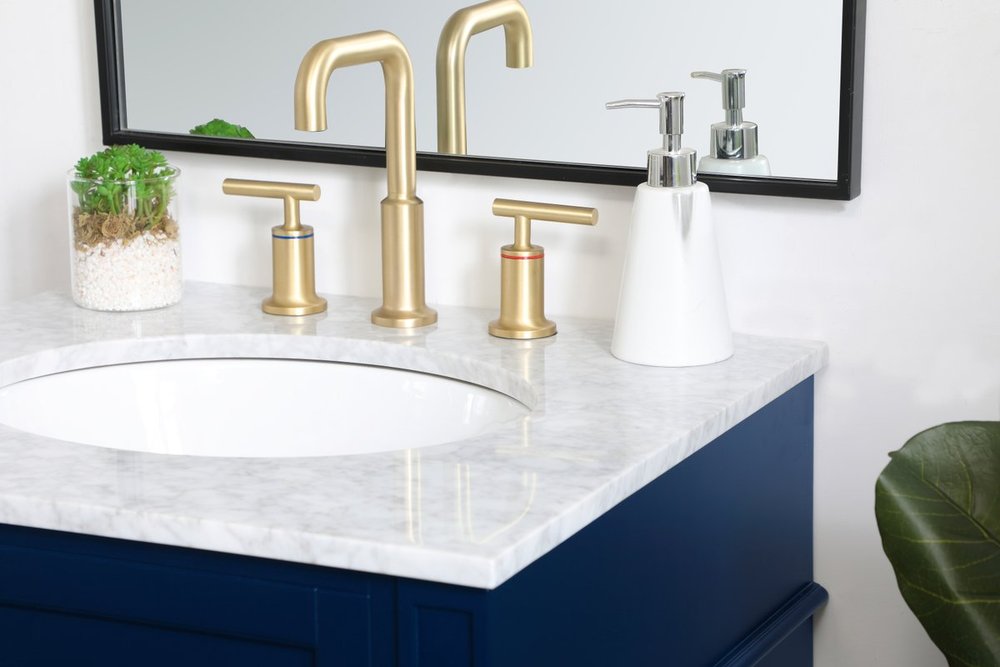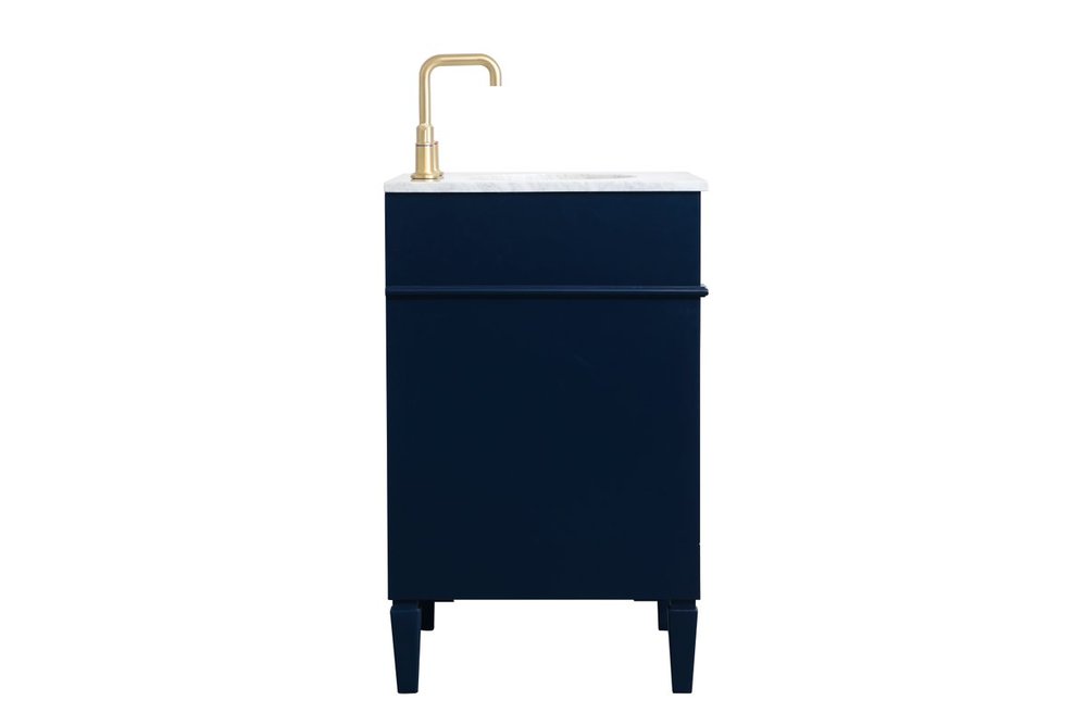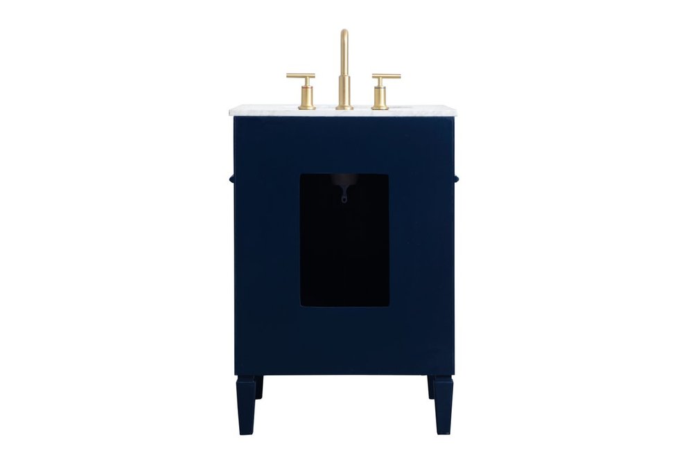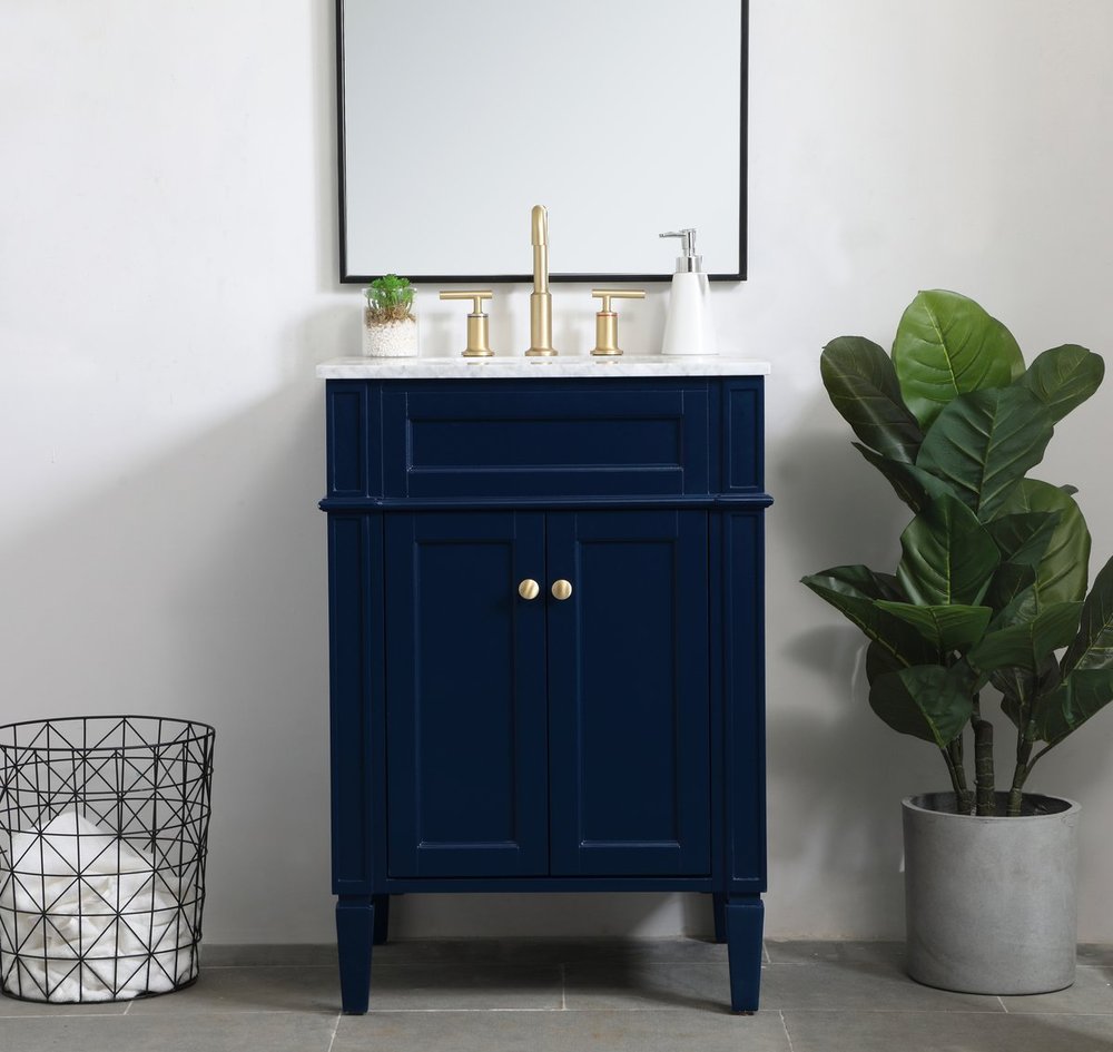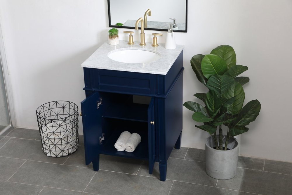Modern sophistication is defined within the urbane blue finish and brushed gold knobs of this compact vanity. Its modest length makes it the perfect addition to any sized home, and saves space with its storage area hidden behind the double cabinet doors. Topped with a Carrara white marble counter top and a porcelain sink, this design will add everlasting class to your bathroom and powder room.