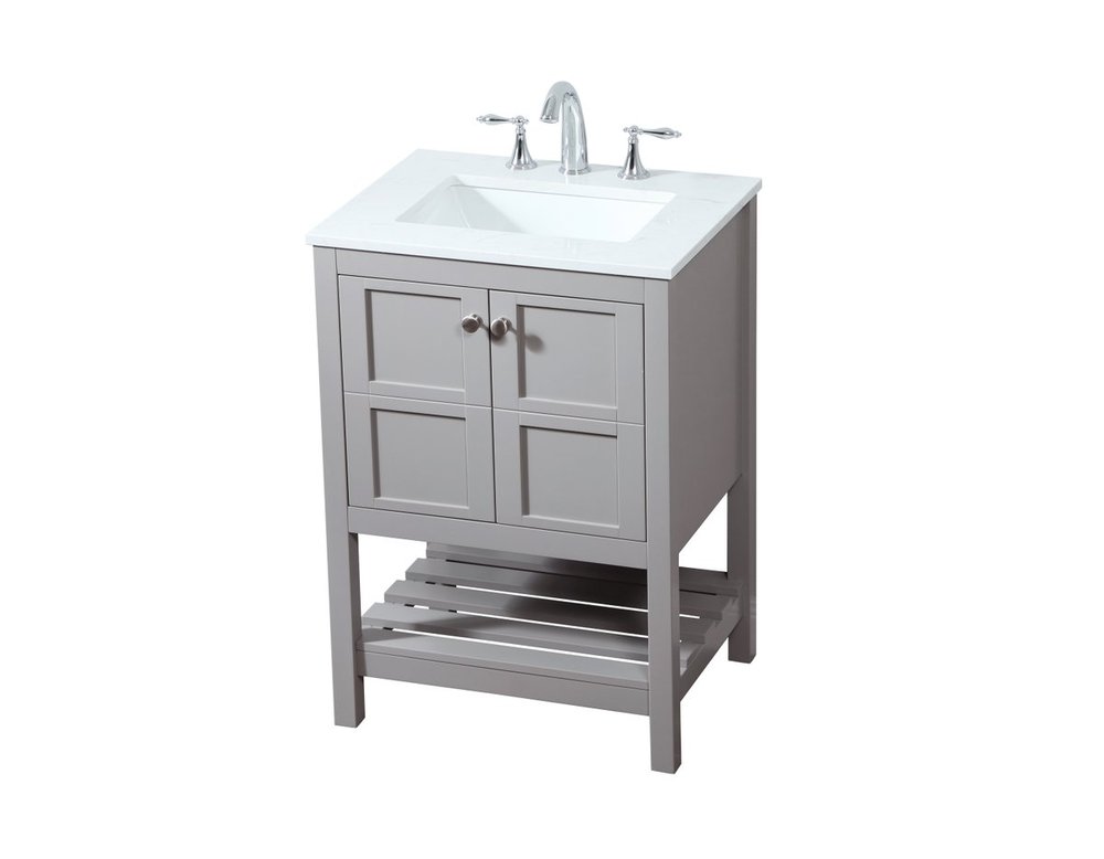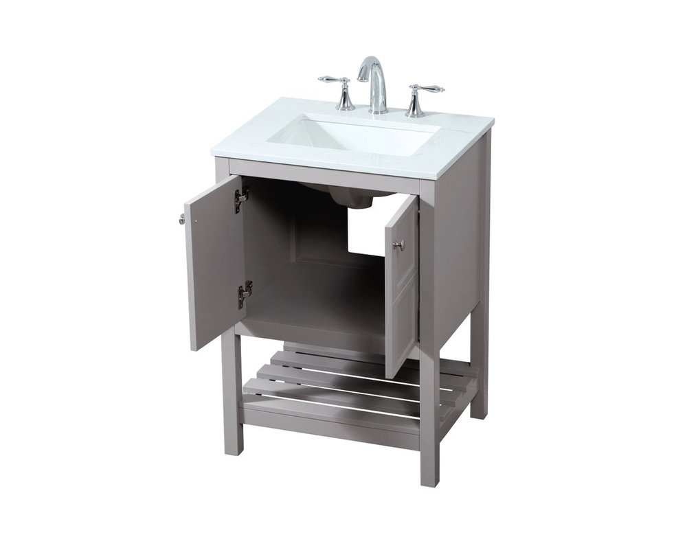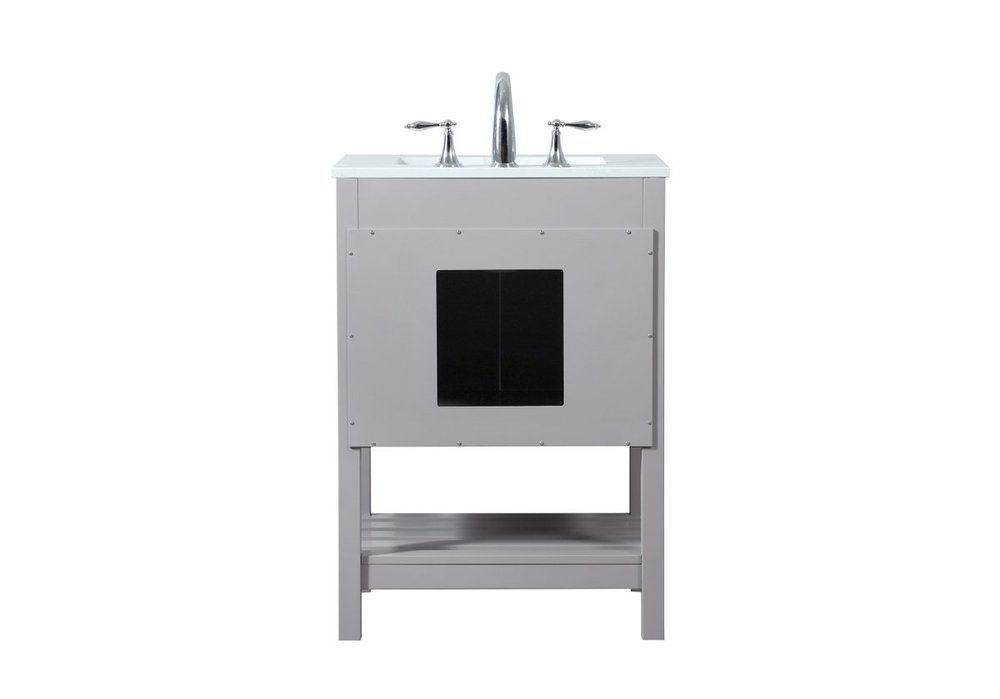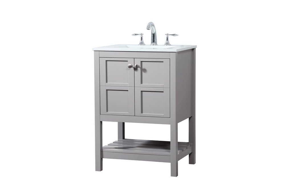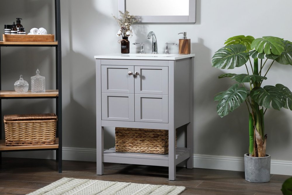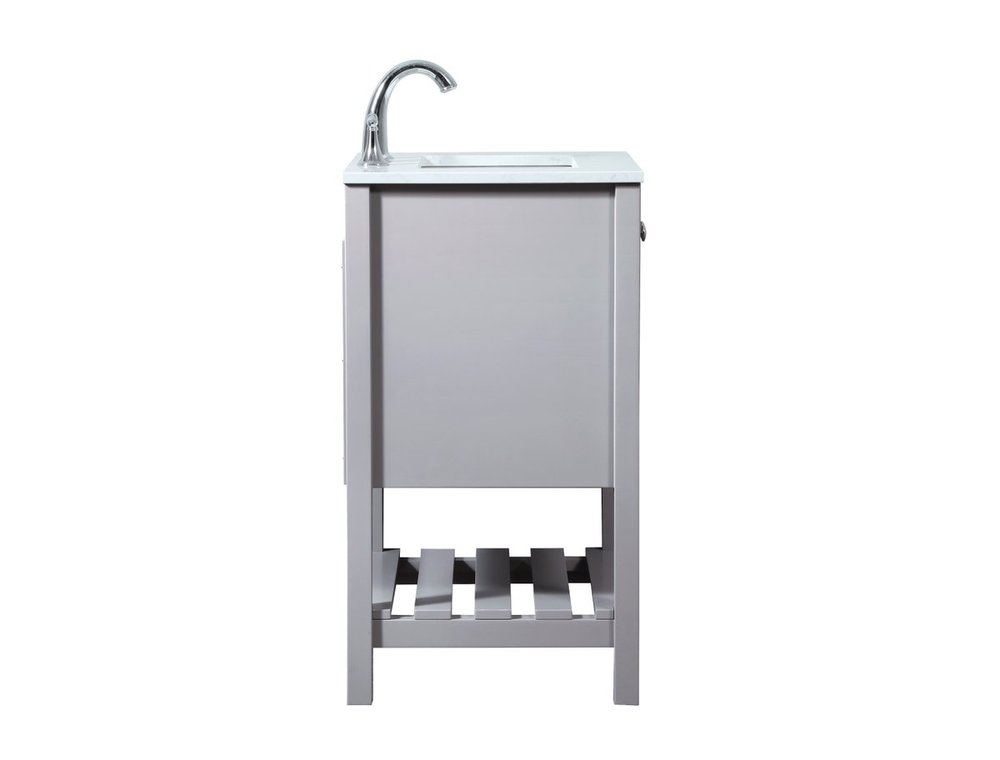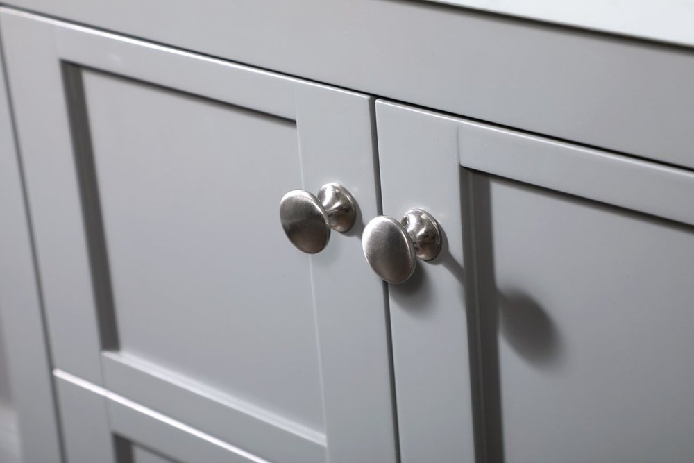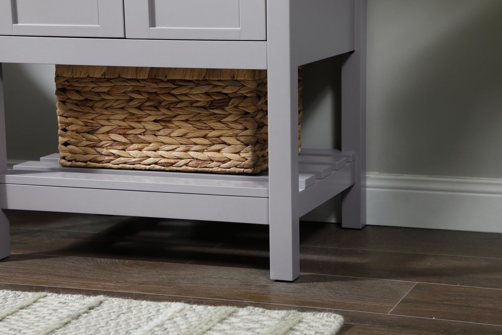 The subtle beauty of the Theo collection vanity exudes comfortable luxury. Its modern, yet traditional beauty will surely dress up your bathroom or powder room without any fuss. The calacatta engineered marble countertop and porcelain undermount sink shows quiet opulence, and the legs support upright without fail. Brushed nickel hardware complements the trendy gray finish, with pulls adorning the two cabinet doors, showcasing ample storage space within. Slated shelf allows for additional space to organize your towels. Whether this vanity is in your bathroom or for guests, its presence will surely elevate the aesthetics of your room.