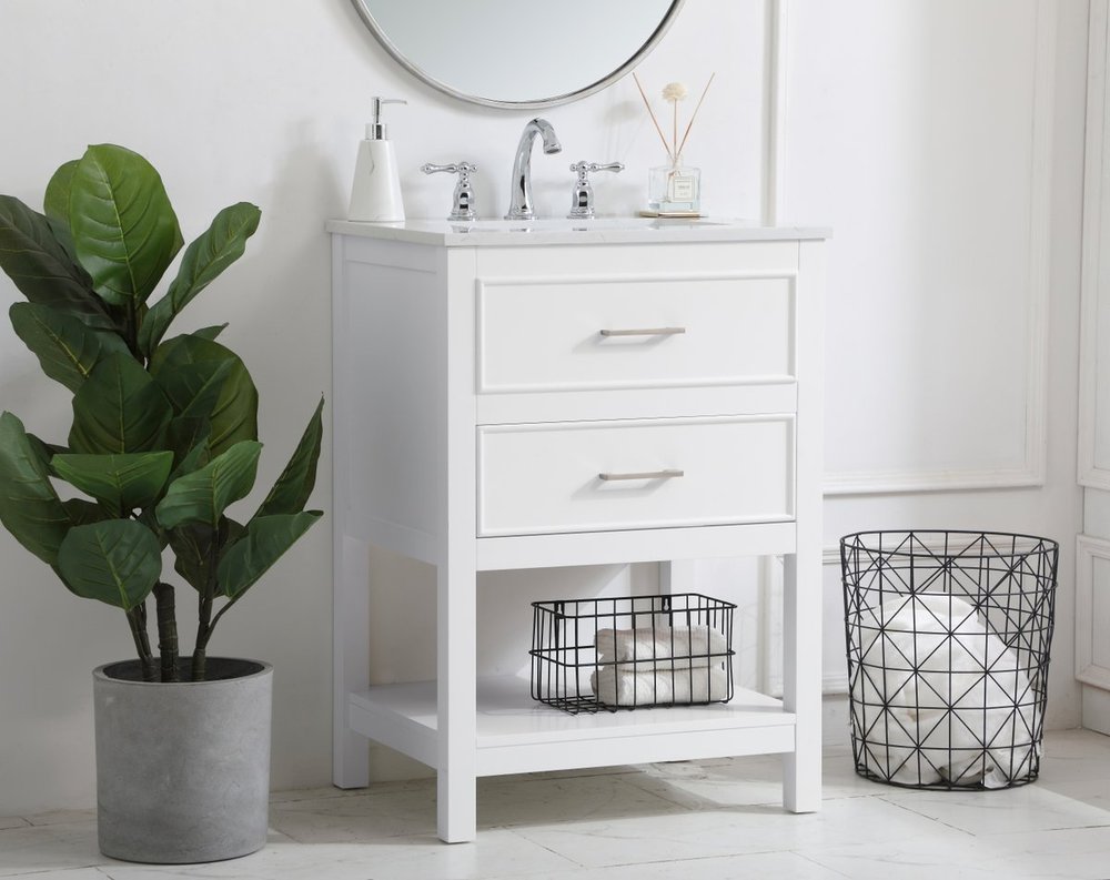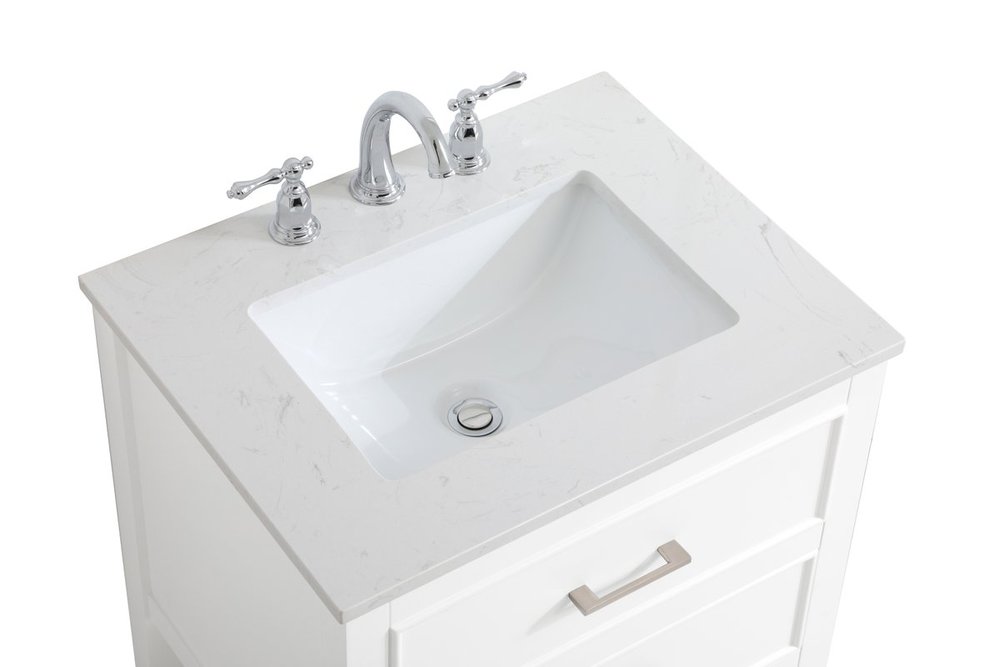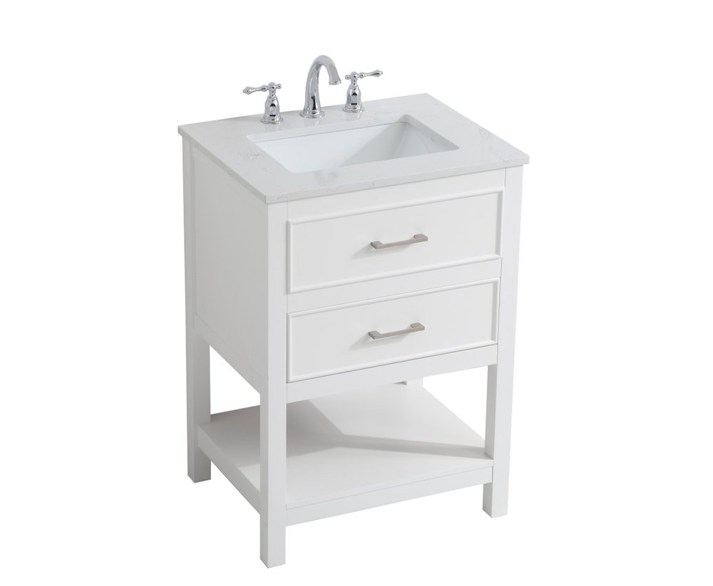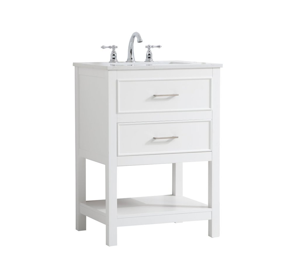 Make the most of your space with this 24" traditional style bathroom vanity. Its traditional style is able to complement many aesthetics with its white finish, Calacatta engineered marble countertop, and the contemporary slender brushed nickel handle bar that sits on the upper false drawer and the lower u-shaped drawer, allowing you to store an assortment of bathroom essentials. The lower shelf makes it the perfect space to hold new towels for your guests. This compact vanity ensures both form and function in your bathroom or powder room for you and your guests.