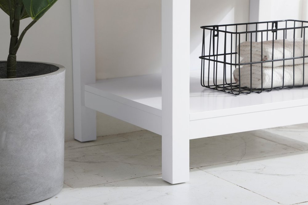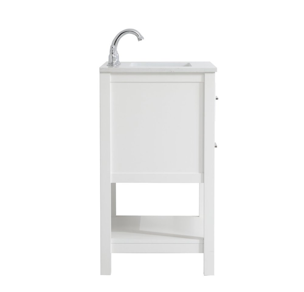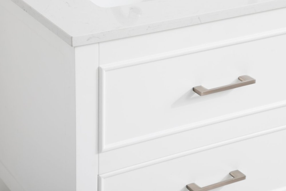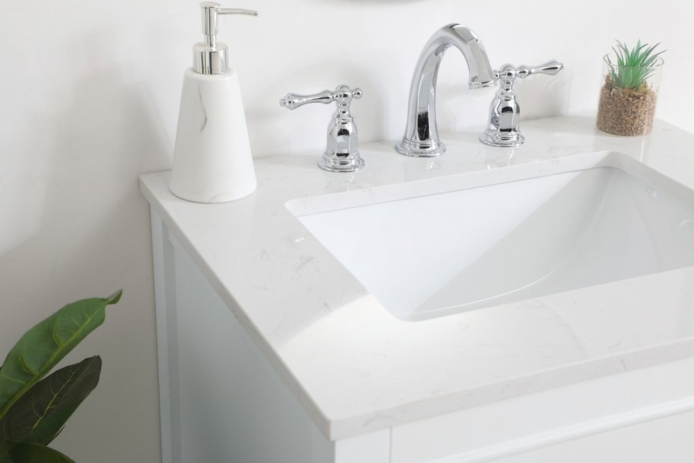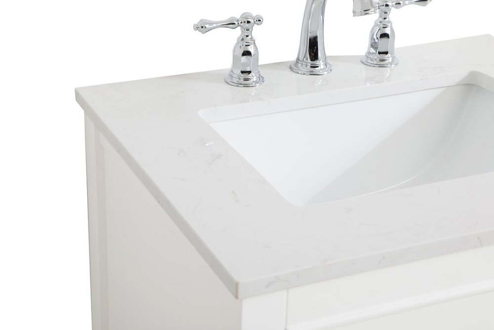 Make the most of your space with this 24" traditional style bathroom vanity. Its traditional style is able to complement many aesthetics with its white finish, Calacatta engineered marble countertop, and the contemporary slender brushed nickel handle bar that sits on the upper false drawer and the lower u-shaped drawer, allowing you to store an assortment of bathroom essentials. The lower shelf makes it the perfect space to hold new towels for your guests. This compact vanity ensures both form and function in your bathroom or powder room for you and your guests.