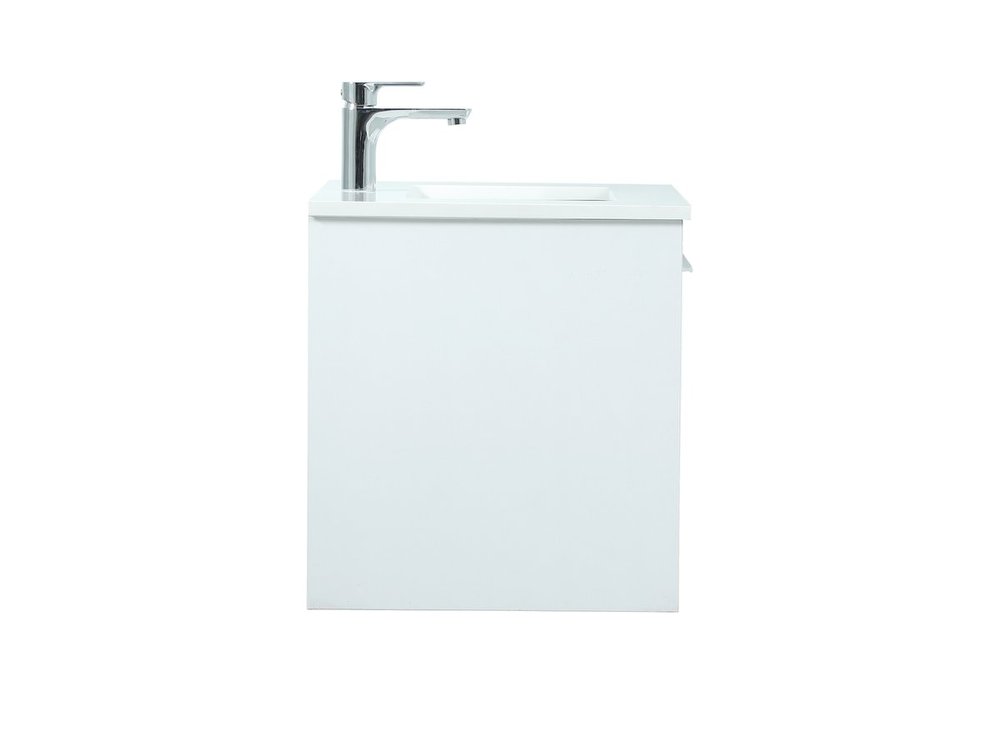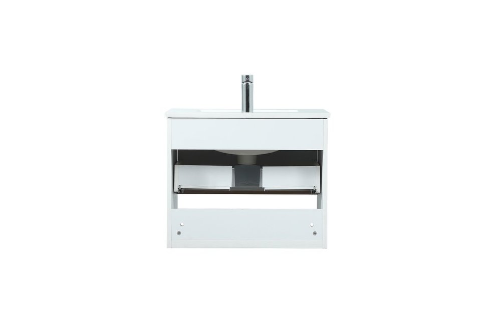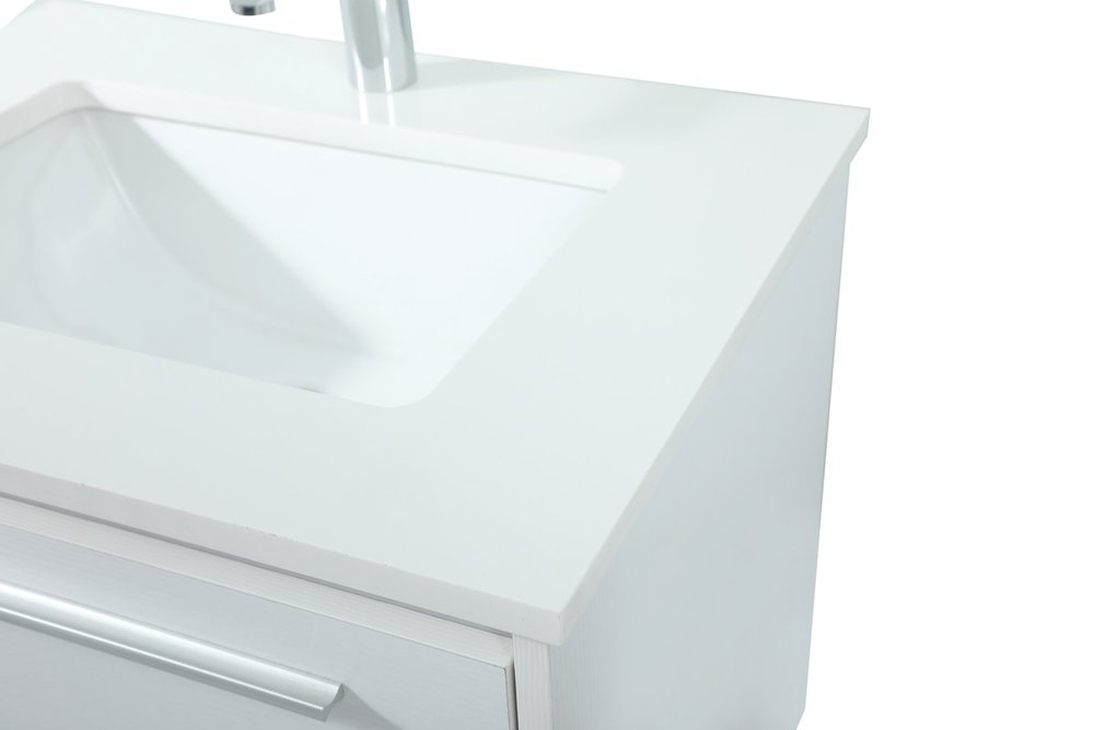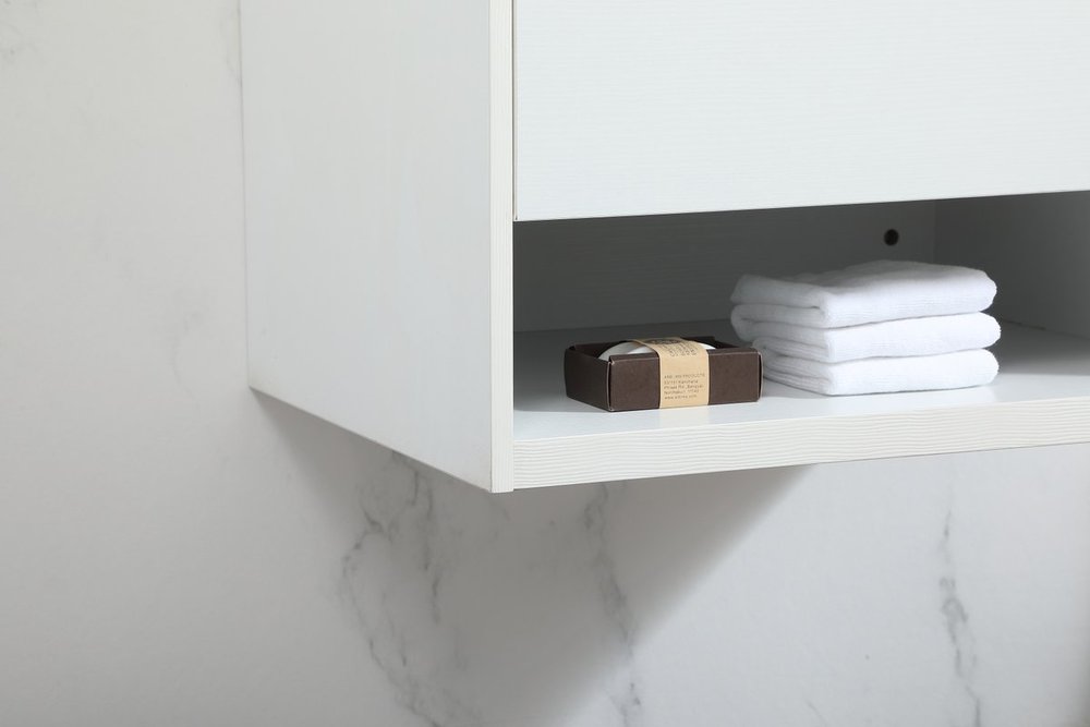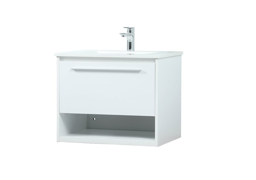 Save space and make your bathroom appear bigger with this floating vanity. Its minimal design will have you in awe, while its clean lines will leave your room feeling fresh and uncluttered. The Single u-drawer pulls out for storage while the open space below allows you to place extra towels or various other essentials. The ivory white engineered marble counter top with porcelain sink adds refined luxe while the aluminum barpull style handle adorn the vanity face.