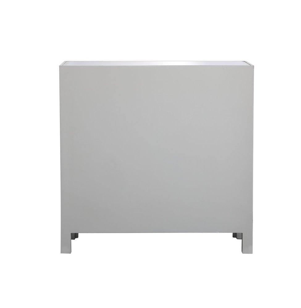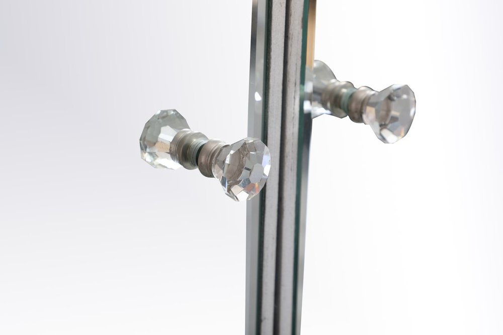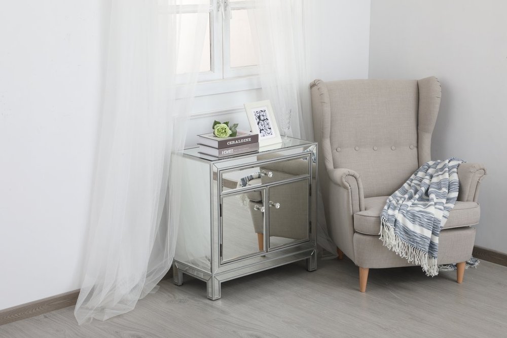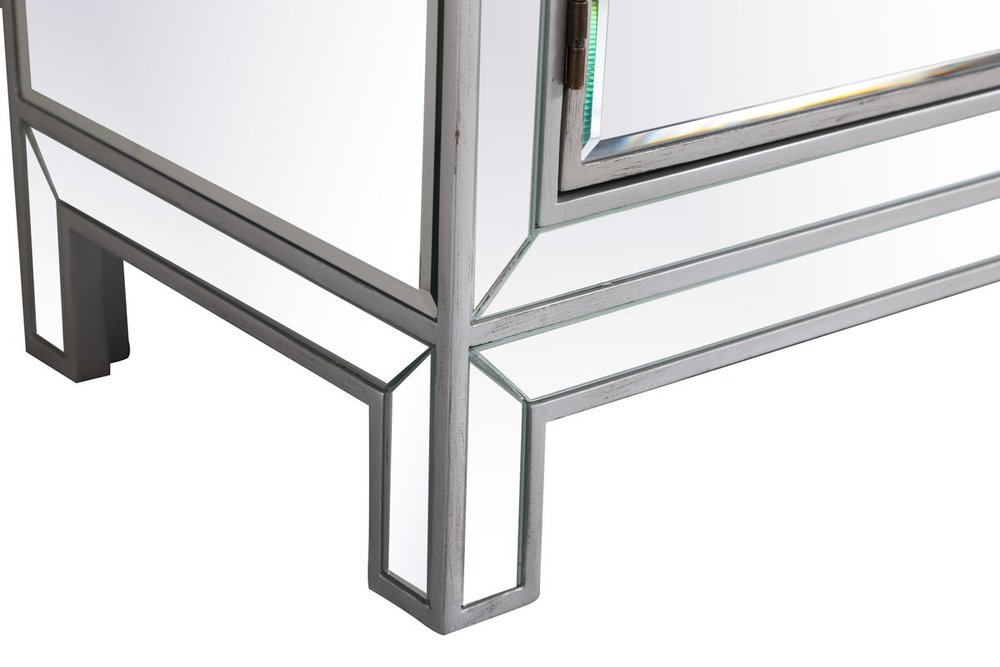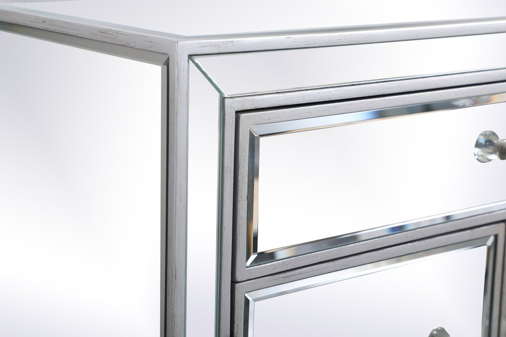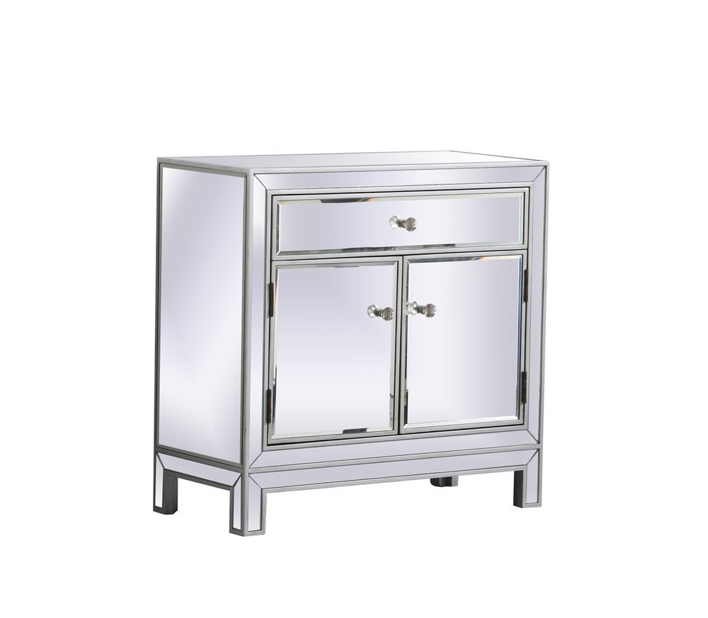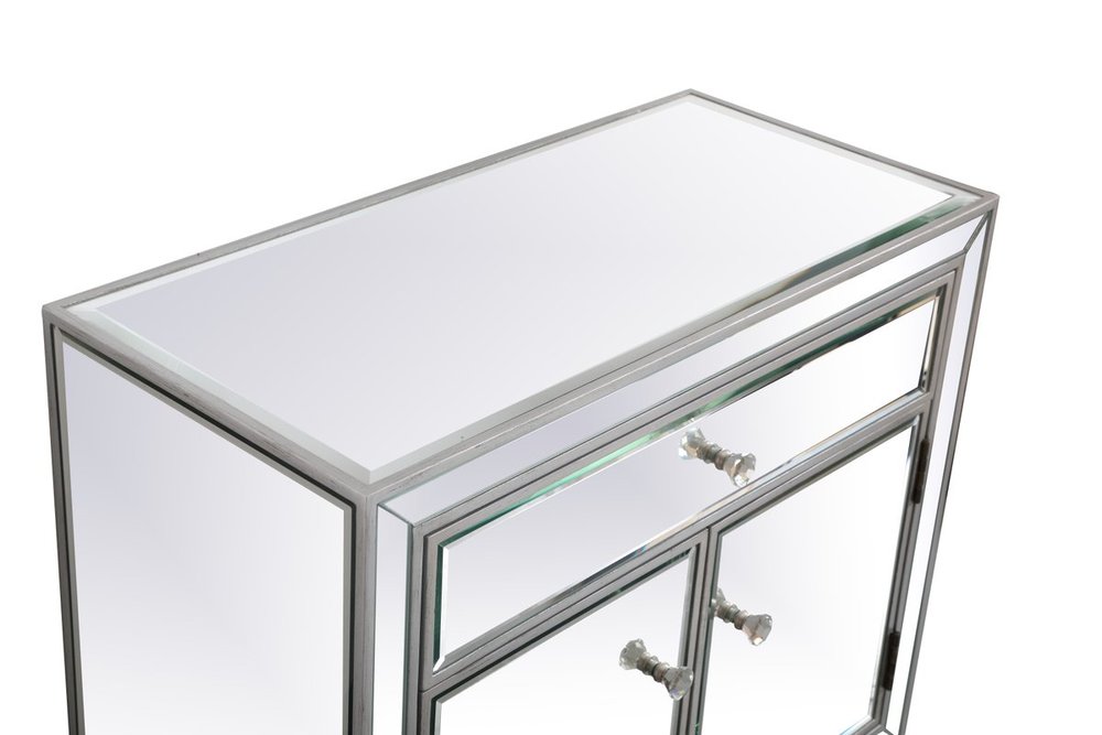 A perfect balance of contemporary style and practical utility, this chic one drawer, two doors mirror cabinet will enhance any room in your home. Featuring a hand paintedSilver finish, top quality mirror panels in distinctive mitered corner, jewel like crystal door knobs, it will provide you with stylish storage space you often need.