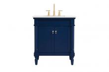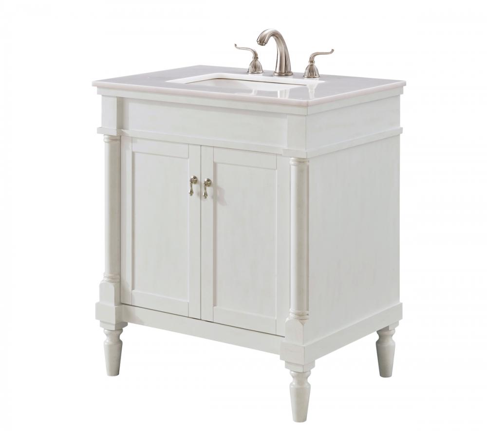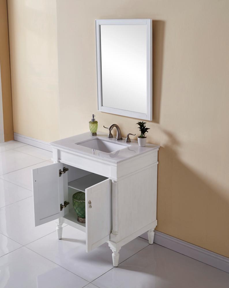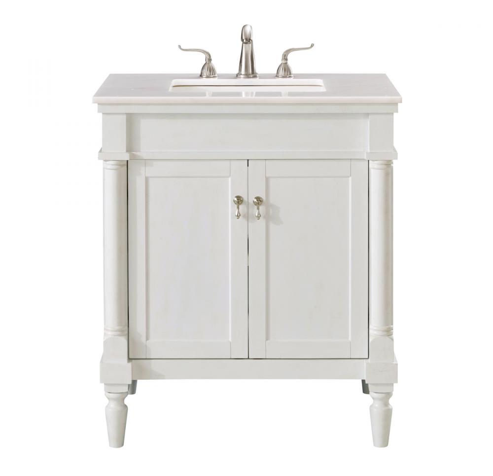 This Traditionally styled, yet fashionably designed vanity can add distinction and grace to your home or office bathroom. Beautifully combining a lustrous natural white marble countertop with a large rectangular white porcelain under mount sink, and a hand painted antique white 2-door cabinet with a shelf inside, brushed steel door pulls, standing on turned, tapering legs. You’ll enjoy its charming allure for many years to come. Measurements: W30” x D21” x H35”