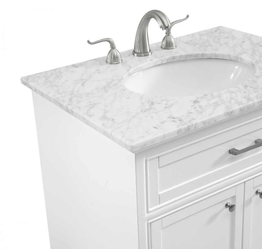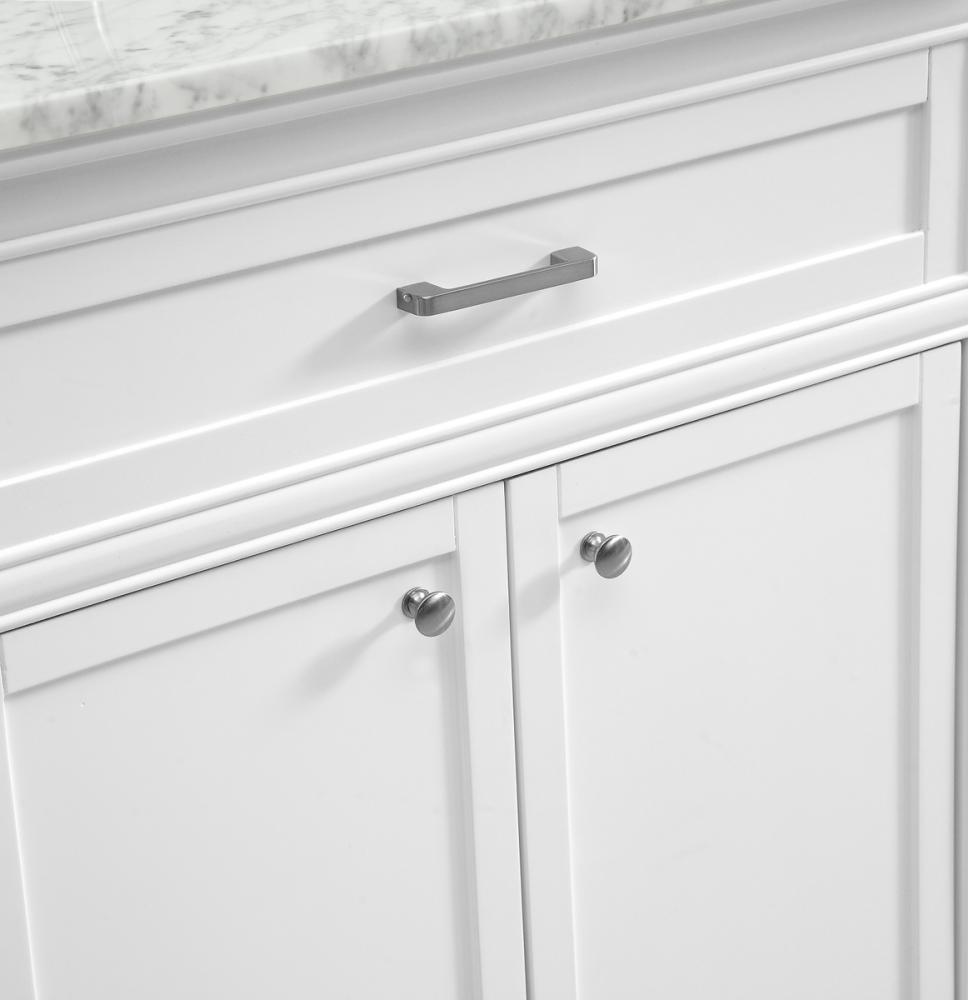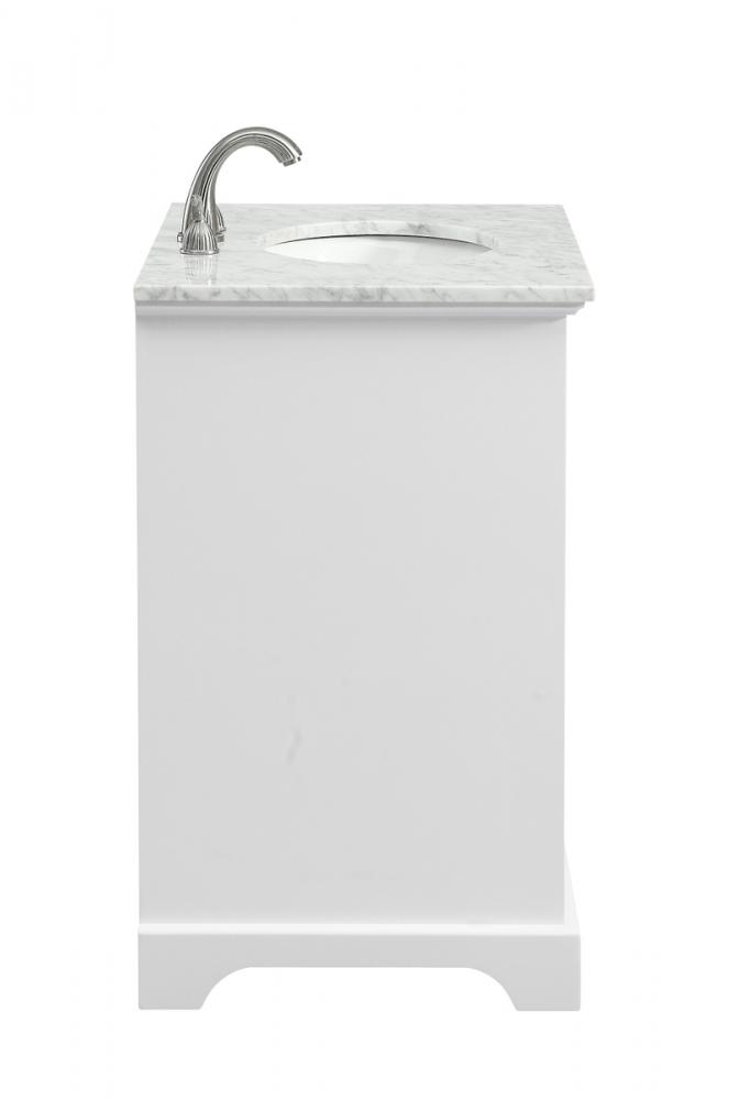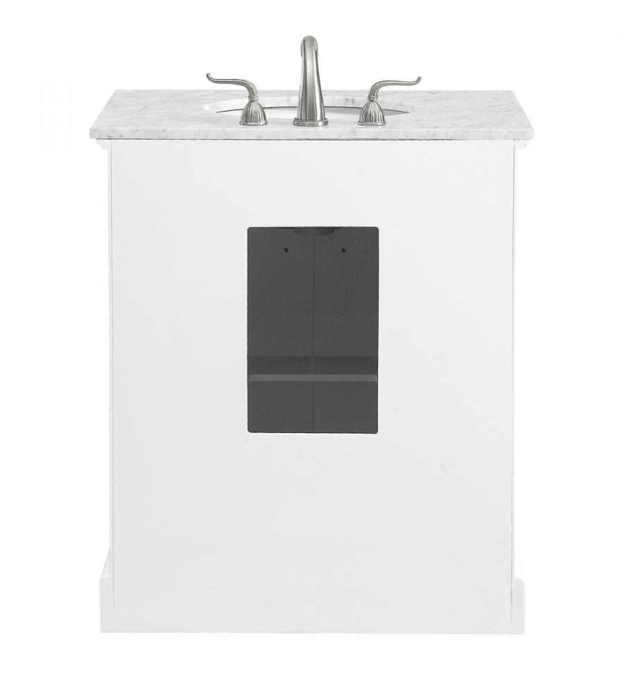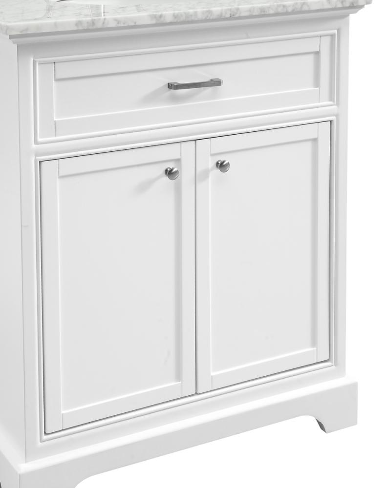 From its Italian Carrara white marble top to its contemporary-styled hand painted white cabinet, this member of our “Americana” vanity collection is sure to enhance either your home or office bathroom. Beneath its lustrous, natural marble top and an oval, white porcelain under mount sink, a handsome 2-door cabinet with a Single shelf for all your bathroom essentials, highlighted with recessed panel doors, brushed steel bar handle and knobs, stands on strong solid pedestal feet. A wonderful balance of simplicity and practical function! Measurements: W30”xD21.5”xH35”