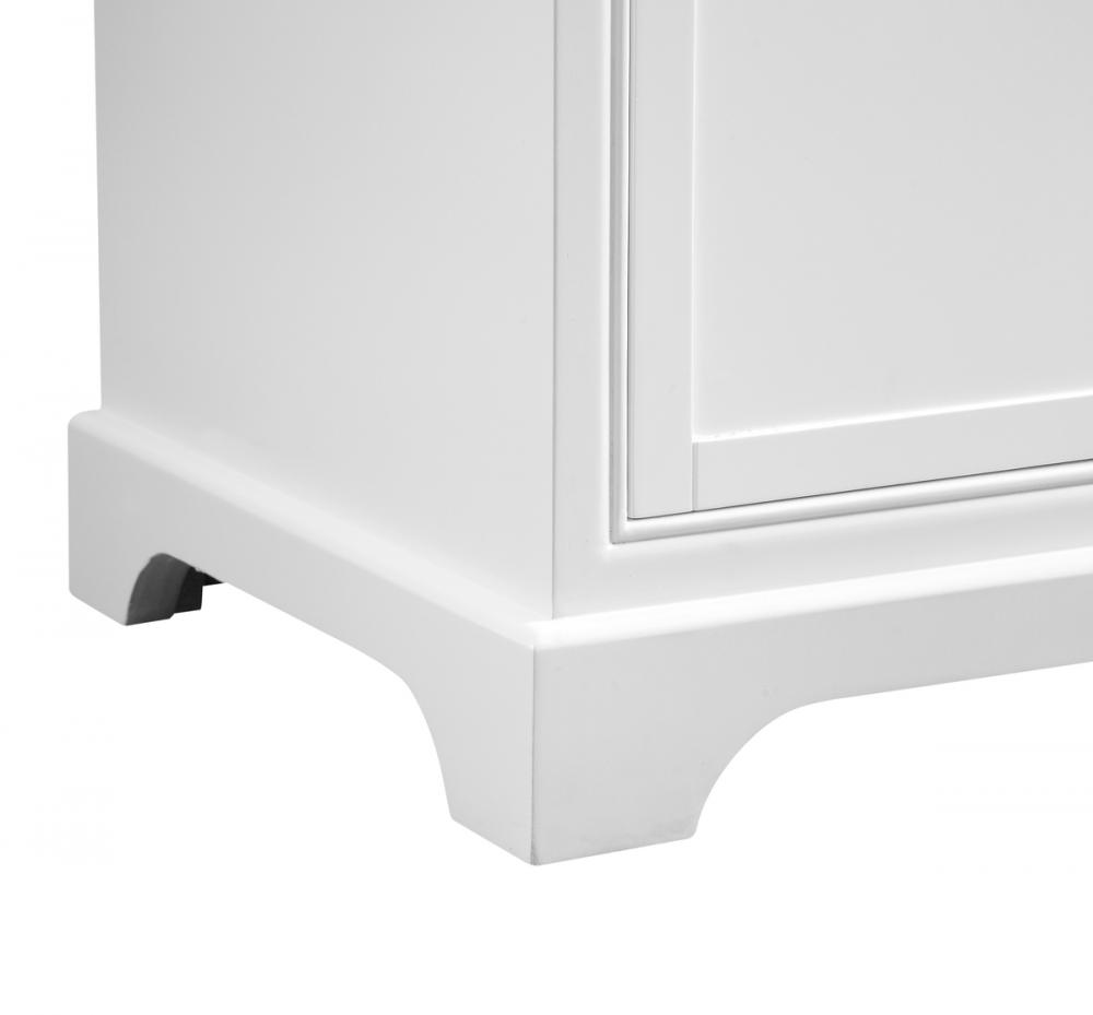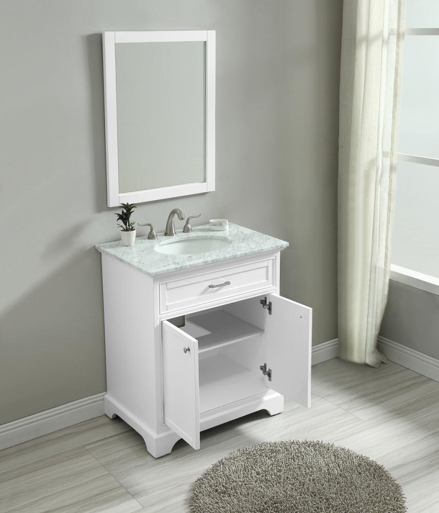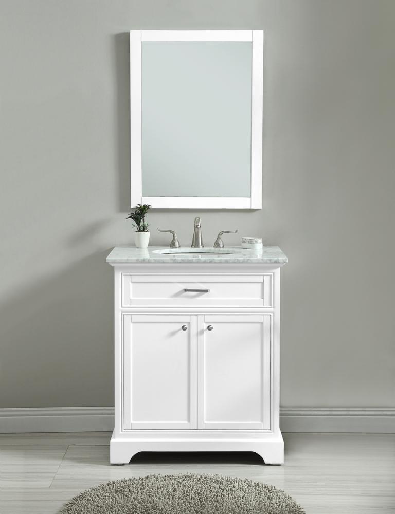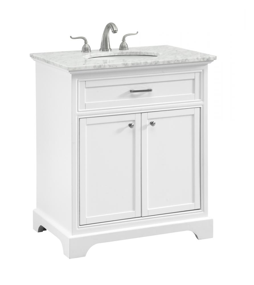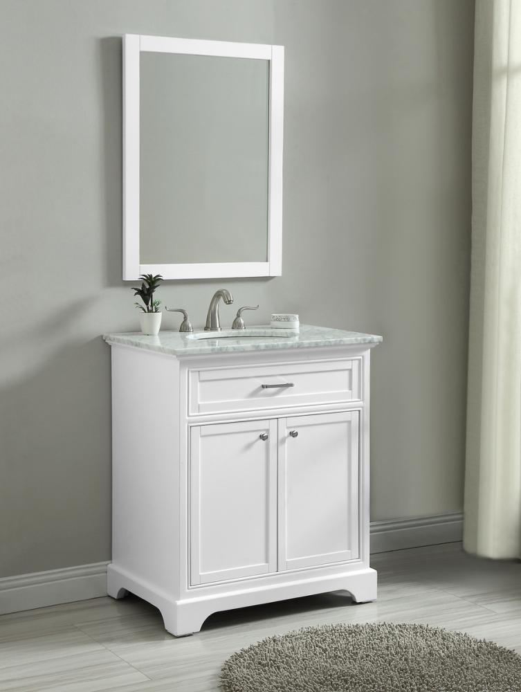 From its Italian Carrara white marble top to its contemporary-styled hand painted white cabinet, this member of our “Americana” vanity collection is sure to enhance either your home or office bathroom. Beneath its lustrous, natural marble top and an oval, white porcelain under mount sink, a handsome 2-door cabinet with a Single shelf for all your bathroom essentials, highlighted with recessed panel doors, brushed steel bar handle and knobs, stands on strong solid pedestal feet. A wonderful balance of simplicity and practical function! Measurements: W30”xD21.5”xH35”